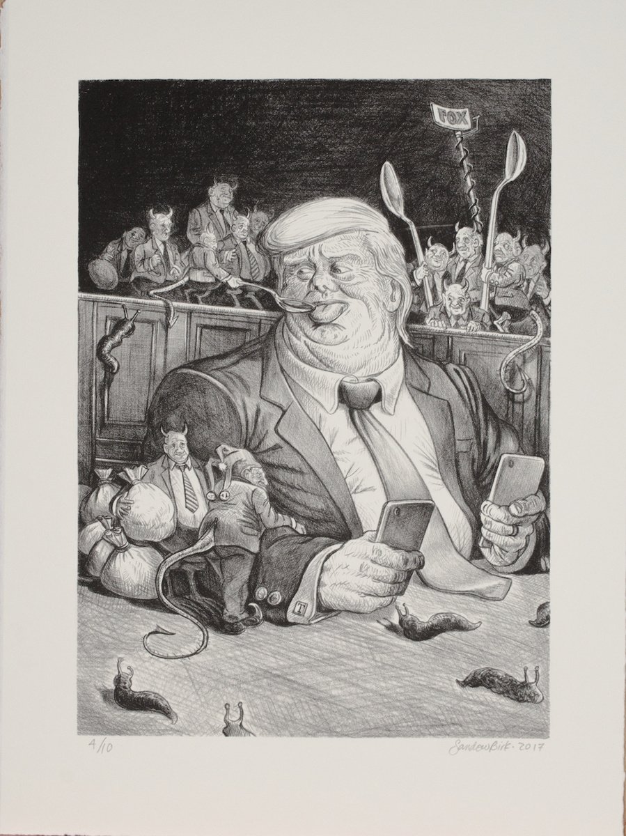 Y, por supuesto, "las horribles palabas y acciones de Trumpagruel -como define al presidente norteamericano- también tienen cabida en la serie 'El Triunfo del Odio'". Las obras de Birk muestran a un Trump cariturizado, enorme, pendiente siempre de su teléfono, rodeado de manipuladores aliados políticos. Sandow Birk alude a 'Gargatua y Pantagruel', escrito por François Rabelais en el siglo XVI, como inspiración.