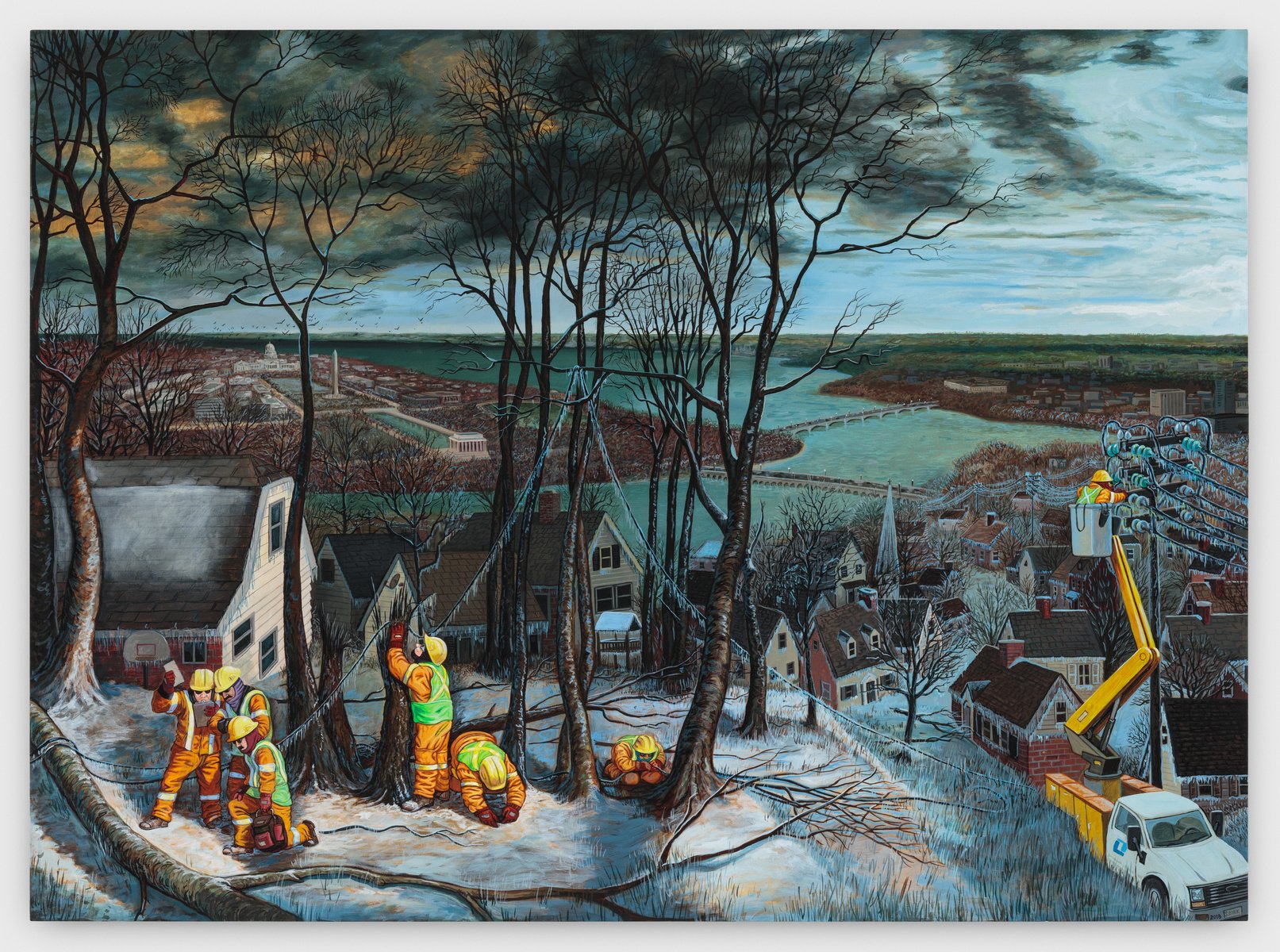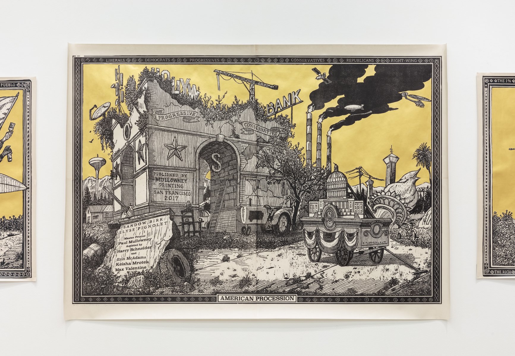 La serie se completa con 'La procesión americana', la obra de mayor tamaño creada por Birk hasta la fecha. Esta formada por tres impresionantes blocques de madera, realizados en colaboración con la artista Elyse Pignolet. La obra en su conjunto mide más de doce metros. La pintura refleja un desfile ficticio de figuras de la historia estadounidense, cuya influencia participó en dar forma a los tiempos en que vivieron, para bien o para mal. Birk elude a personajes conocidos como Kennedy, Lincoln o Martin Luther King y concede protagonismo en su 'procesión' a personas menos conocidas pertenecientes al espectro opuesto a la política. Los personajes progresistas caminan hacia la derecha; mientras que los conservadores lo hacen hacia la izquierda, dirigiéndose ambos hacia la confrontación en el panel central. En el cuadro central se observa un arco del triunfo en ruinas, entre escombros, la antorcha de la estatua de La Libertad, piezas del letrero 'Hollywood', una silla eléctrica, una soga, una casa de la América profunda, un neumático viejo y un helicóptero colgando de una estación de abastecimiento energético. Birk abarca la historia de Estados Unidos y parece preguntarse ¿Cómo hemos llegado a esto?/J.M.