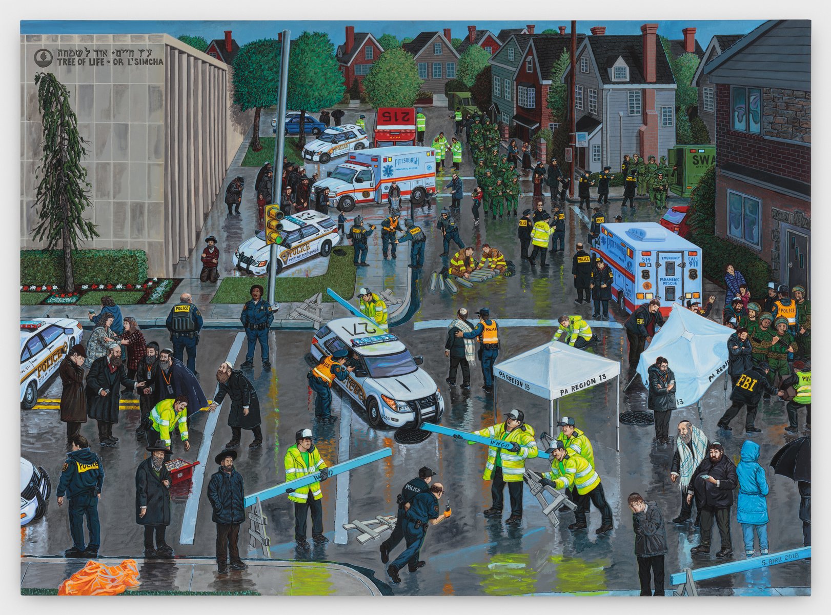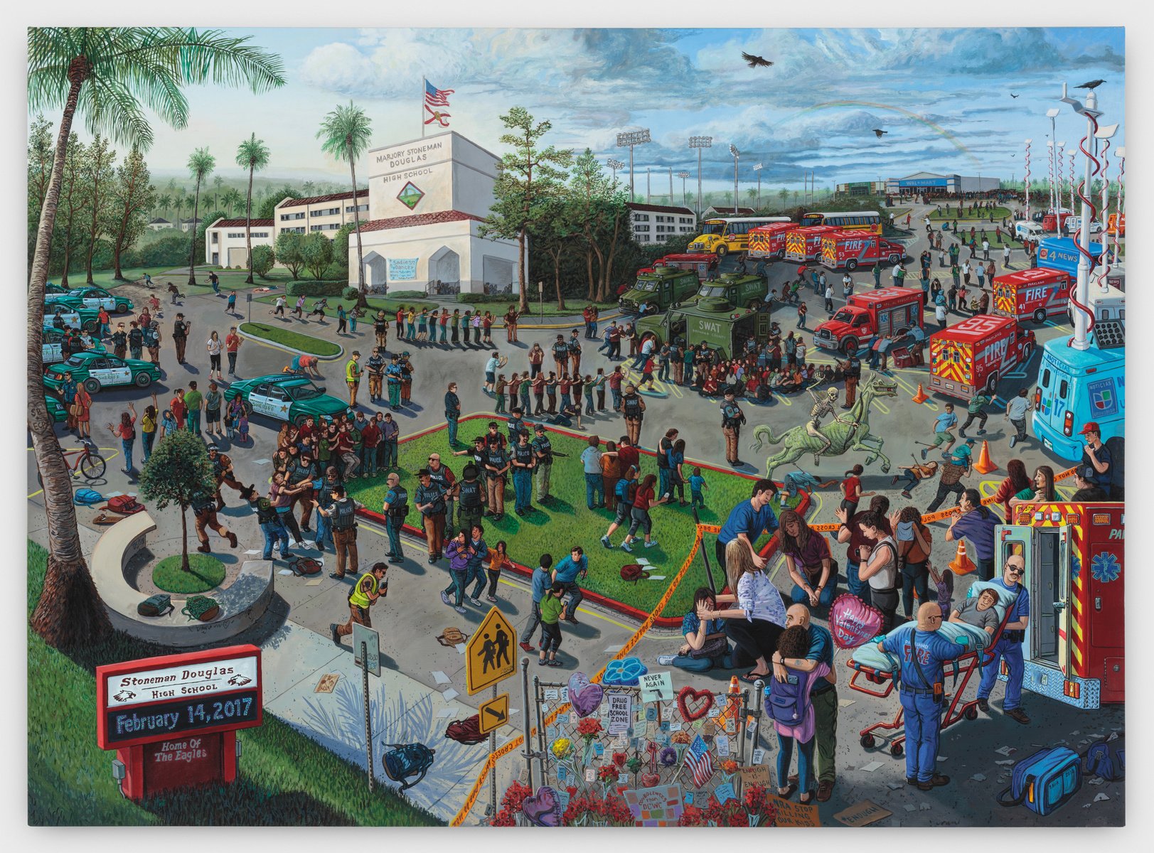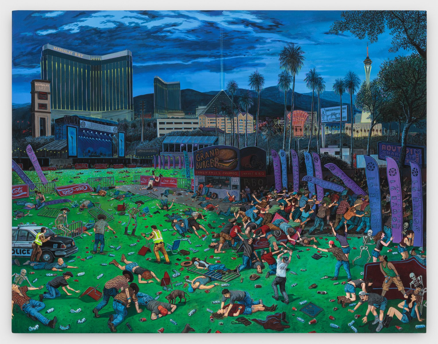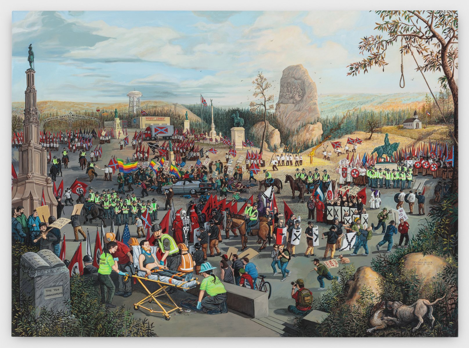 Birk es conocido en el mundillo artístico de Los Ángeles por su fuerte compromiso político y su depurada técnica artística. 'El triunfo del odio' marca su regreso a la pintura, tras experimentar con el grabado, la madera, las litografías o los dibujos a gran tamaño que le han tenido ocupado en los últimos años. Las obras que componen 'El triunfo del odio' representan eventos recientes de la cultura estadounidense. Pinturas que requieren una mirada detenida, ya que poblados de multitudes no son legibles de forma inmediata. Una pausa ante las obras de Birk revela el hilo político que alude a acontecimientos siniestros o trágicos de la vida contemporánea. Ahí surgen tiroteos masivos como el del festival de música de Las Vegas en 2017 o la marcha de supremacistas blancos de Charlottesville, entre otros.