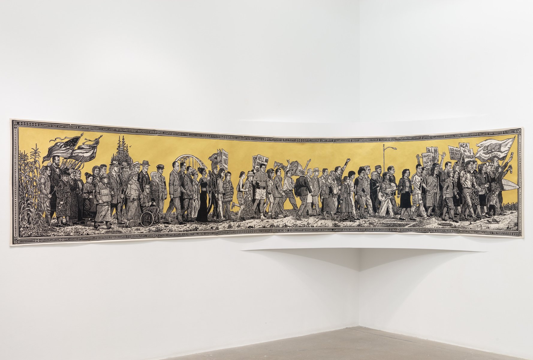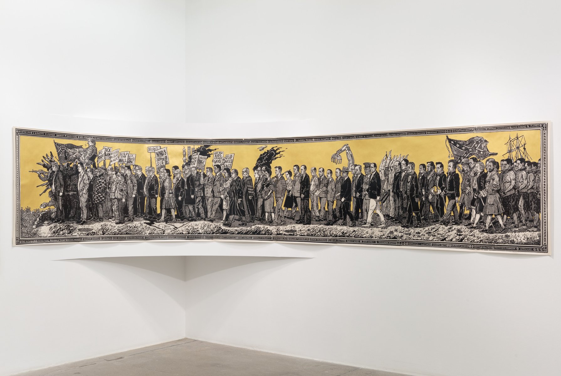 Sandow Birk es conocido principalmente por sus trabajos de corte político en los que representa escenas conteporáneas insporadas en pinturas y textos históricos. El pasado 9 de febrero concluyó la exposición 'El triunfo del odio' (Thriump of hate) en la galería PPOW de Nueva York, en la que el artista norteamericano (Detroit, 1972) ha mostrado su última colección de obras. 'El trinfo del odio' habla y retrata las injusticias sociales al tiempo que se inspira en el panorama político actual y continúa con su investigación sobre los usos de prácticas tradicionales para ofrecer una nueva perspectiva sobre los eventos contemporáneos.