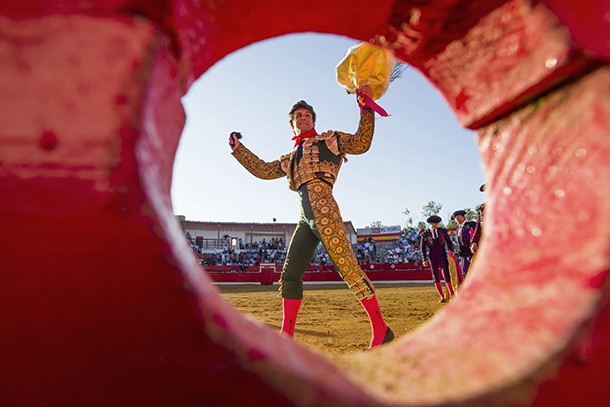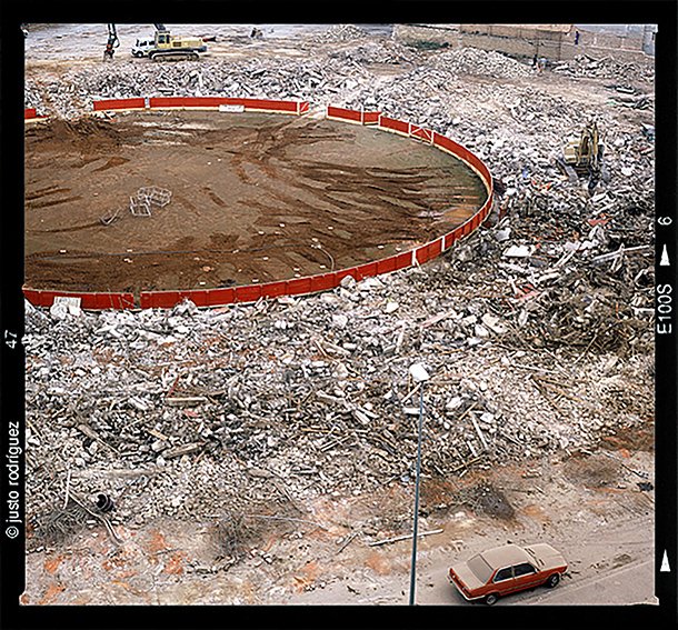 Sí, alguna tengo. El otro pensé que la tengo que recuperar. La realicé en diapositiva y en formato medio. La tomé con una Hasselblad, que también compré con el dinero que iba ganando y que es la cámara que subió a la luna -no la mía (bromea). Es una toma casi cenital -las tomas cenitales son de mis preferidas- y es una vista de la antigua plaza de toros ‘La Manzanera’ ya derruida. La foto creo que logré construirla de una manera atractiva. Me gusta. La plaza está derruida completamente, hay escombros, pero se contempla muy bien dibujado el ruedo, el albero, y la barrera, que es roja. Casualidades de la vida, cuando hice la foto estaba aparcado un BMW. Además, siempre está el componente emocional de que mi padre hubiera trabajado en esa plaza de toros. Se suma el vínculo afectivo.