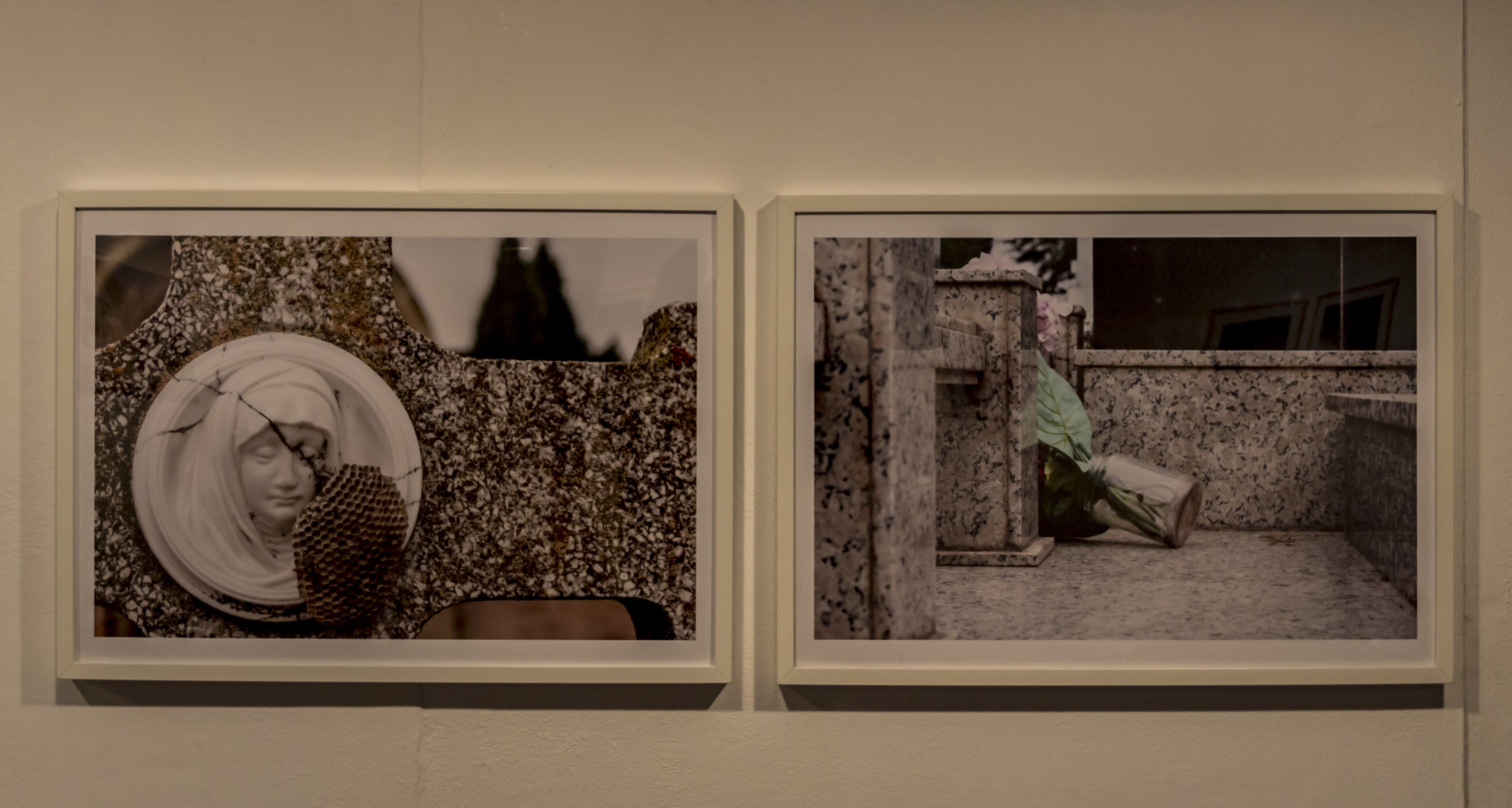 El Kintsugi’, la técnica centenaria japonesa que consiste en reparar las piezas de cerámica rotas y que se ha convertido en una filosofía de vida -frente a las adversidades y los errores hay que saber recuperarse y sobrellevar las cicatrices-, surge en el trasfondo de las fotografías de Cristina Avellanal. “Entendí el cementerio como algo cotidiano recordando que en algunas ciudades se encuentran en lugares céntricos y son como parques por los que la gente pasea. Allí encontré la lápida con la figura atravesada por una grieta y reconstruida por el panel de abejas. La fotografía habla de cómo la imperfección puede ser bonita y cómo algo roto se puede reconstruir; cómo las cicatrices no ocultan la belleza y cómo la naturaleza reconstruye la vida quebrada”. El sonido que generó un jarrón con flores de recuerdo junto a un panteón protagoniza la segunda fotografía de la serie de Cristina. “Los sonidos están presentes en el día a día y me pregunto a través de esa imagen si alguien escuchó el ruido de jarrón al volcarse en el cementerio”.