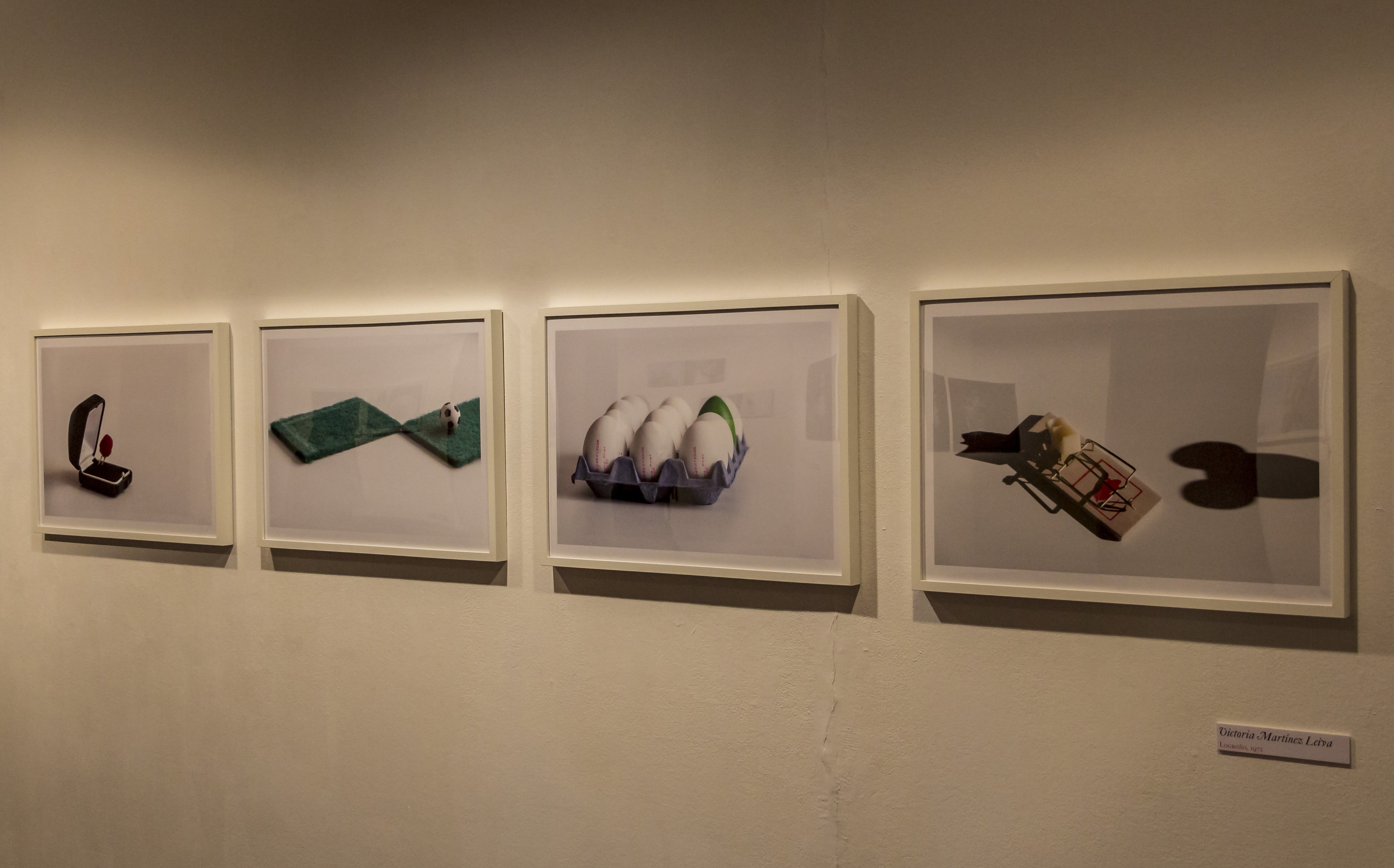 Sobre un blanco poderoso, los objetos cotidianos presiden también las fotografías de Victoria Martínez. Una huevera, un joyero, una porción de estropajo o una trampa para ratones, permiten a la fotógrafa jugar con la realidad y la alteración visual de su significado original. “Me gusta cambiar de lugar o introducir elementos ajenos a la lógica en objetos cotidianos. El color blanco me permite realzar la construcción de la imagen”. Una golosina sustituye al diamante, el balón no encuentra camino a seguir en un terreno de juego parcelado, un intruso de color verde se ha colado en la docena de huevos y, tiene toda la pinta, de que el ratón que acecha nunca caerá en la trampa.