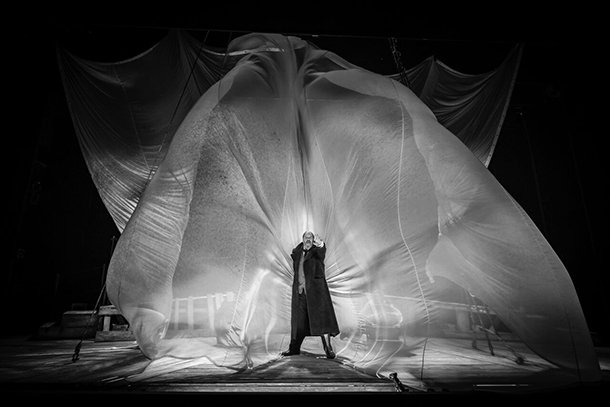 En el ‘Moby Dick’ de Lima no se ve a la ballena blanca, tan sólo se percibe su presencia. Resuella y levanta grandes olas. Es una sombra al fondo, amenazante para unos, tan sólo defensora de su hábitat para muchos. “No hay locura en lo animales de este mundo -se lee en la novela de Melville- que no quede infinitamente superada por la locura de los hombres”. La escenografía se impregna de una melancolía fúnebre y el enorme abrigo que viste José María Pou sobre el escenario describe presagios no muy halagüeños. Son noventa minutos de intenso teatro que se adentran en uno de los personajes centrales de una novela descomunal. Un relato en que el suceden hechos que pudieran parecer inverosímiles, pero que como recuerda Pérez Reverte, en las novelas de aventuras el lector debe de ser capaz de incluirse en la trama y no ser escéptico. “A la novela de aventuras se va como un tahúr a una partida de póker, dispuestos a jugar”. Y no pierdas el tiempo pensando en que punto del océano tuvo lugar la batalla entre los hombres del Pequod y la gran ballena blanca, “no está en ningún mapa, lo lugares verdaderos nunca lo están”./Javi Muro.