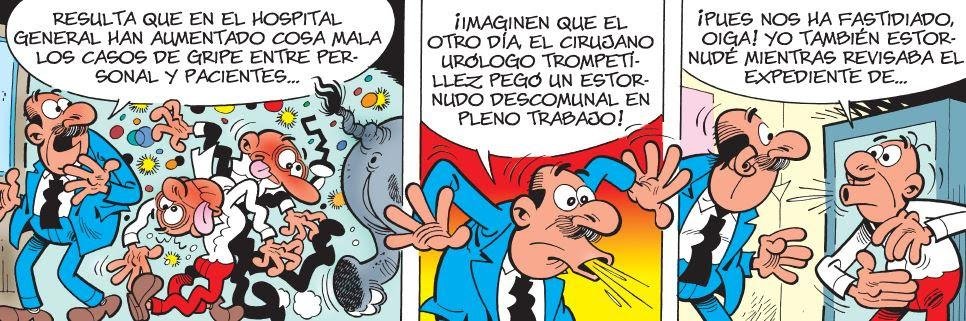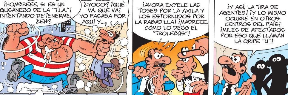 Por increíble que parezca, hace 10 años, Mortadelo y Filemón ya luchaban contra una virulenta gripe que afectaba a varios agentes de la T.I.A..Lo hacían en las aventuras de 'La gripe "U', publicado por Bruguera en la coleccion Magos del Humor (número 134) y Olé!: Mortadelo 187. "Sin embargo -apuntan desde Penguin Random House Grupo Editorial-, aunque hayan pasado 10 años de la publicación, estos días parece que estemos viviendo dentro de esa historieta creada por Francisco Ibáñez. El dibujante demuestra, una vez más, que sus viñetas y creatividad son completamente atemporales. Prueba de ello es este recorrido en viñetas por 10 situaciones que vivieron los agentes de la T.I.A. y que nos adelantaban cosas como;