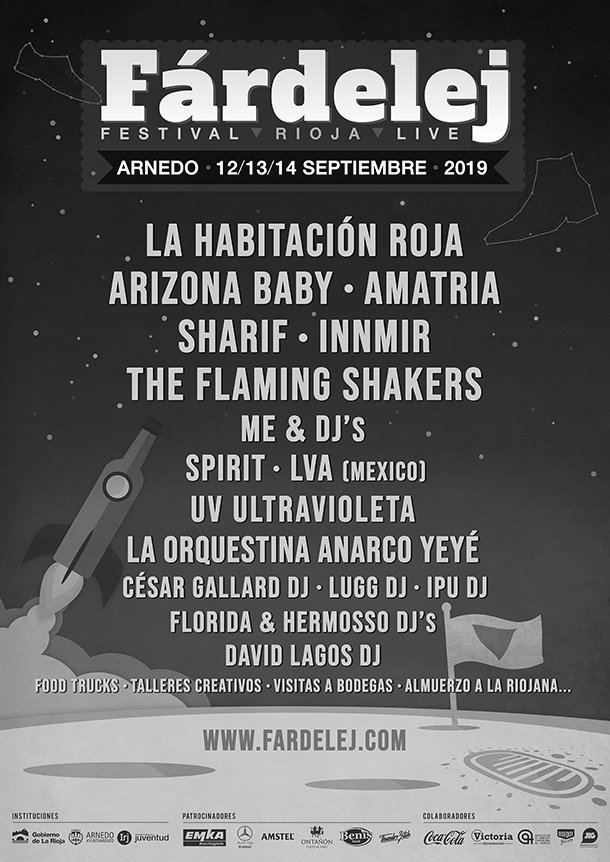 La Habitación Roja, Arizona Baby, Amatria, Sharif, Innmir y The Flaming Shakers son algunos de los artistas que este año completan el cartel del Fárdelej. El festival arnedano multiplica las actividades al aire libre, y el nuevo planteamiento del festival reubica todos sus escenarios en el centro de la ciudad. El teatro Cervantes de Arnedo ha sido el escenario elegido por los directores del Fárdelej, Ernesto García y Manolo Moreno, para presentar el cartel completo del certamen en su edición 2019, que se celebrará del 12 al 14 de septiembre. García Y Moreno estuvieron acompañados por el alcalde de Arnedo Javier García Ibáñez y el concejal de Festejos Raúl Domínguez, así como por varios de los patrocinadores.