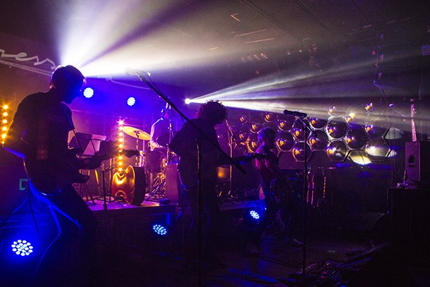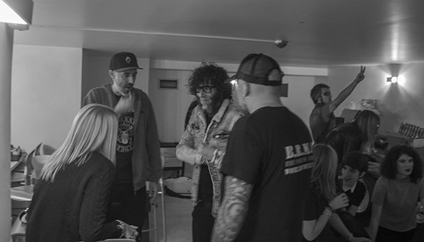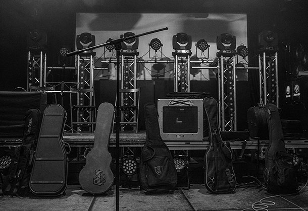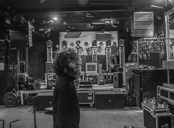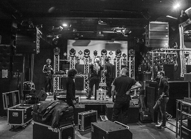 La sala del concierto sin público parece distinta; de alguna manera más pequeña, más recogida. Aún no hay nadie tras las barras y las pirámides invertidas que ejercen de columnas y, al mismo tiempo de aparadores para las botellas parecen dormitar a la espera de la efervescencia rockera que detonará en unas horas. La luz es todavía de oficina. Fuera, en la calle, continua sin llover.