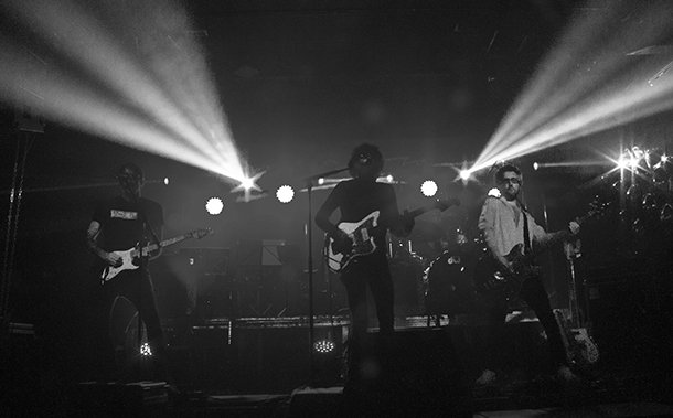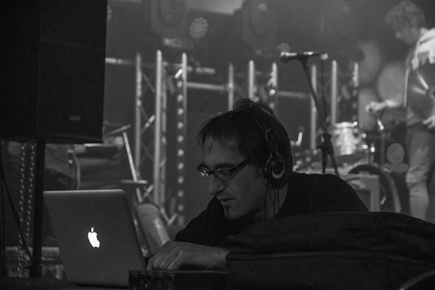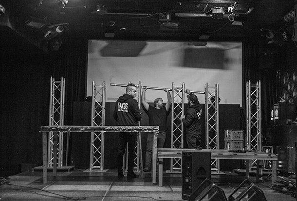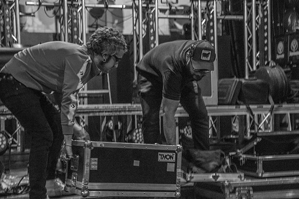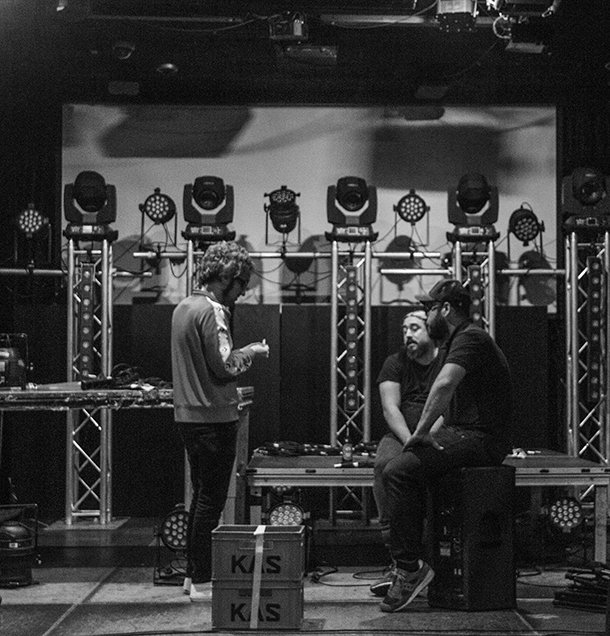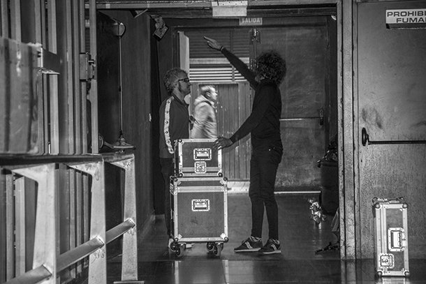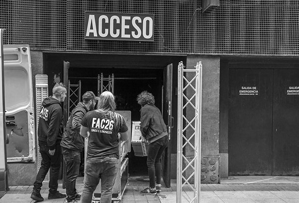 Joselu y Diego observan el escenario desde la pista; arriba Germán, en cuclillas, sitúa las conexiones en el espacio que ocupará sobre las tablas unas horas después, durante el concierto. Los cuatro se agrupan en la pista y escuchan la grabación de la prueba de sonido realizada. Observan concentrados y atentos, como si ellos mismos continuaran aún sobre el escenario a las guitarras, el bajo y la batería, como si asistieran a su propio concierto. Ya lo tienen. Músicos y técnicos rompen en aplausos. Todo el mundo se destensa. En un instante comenzará el ensayo general.