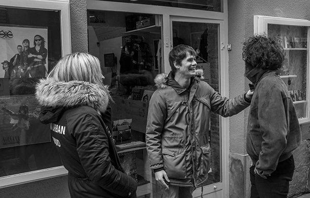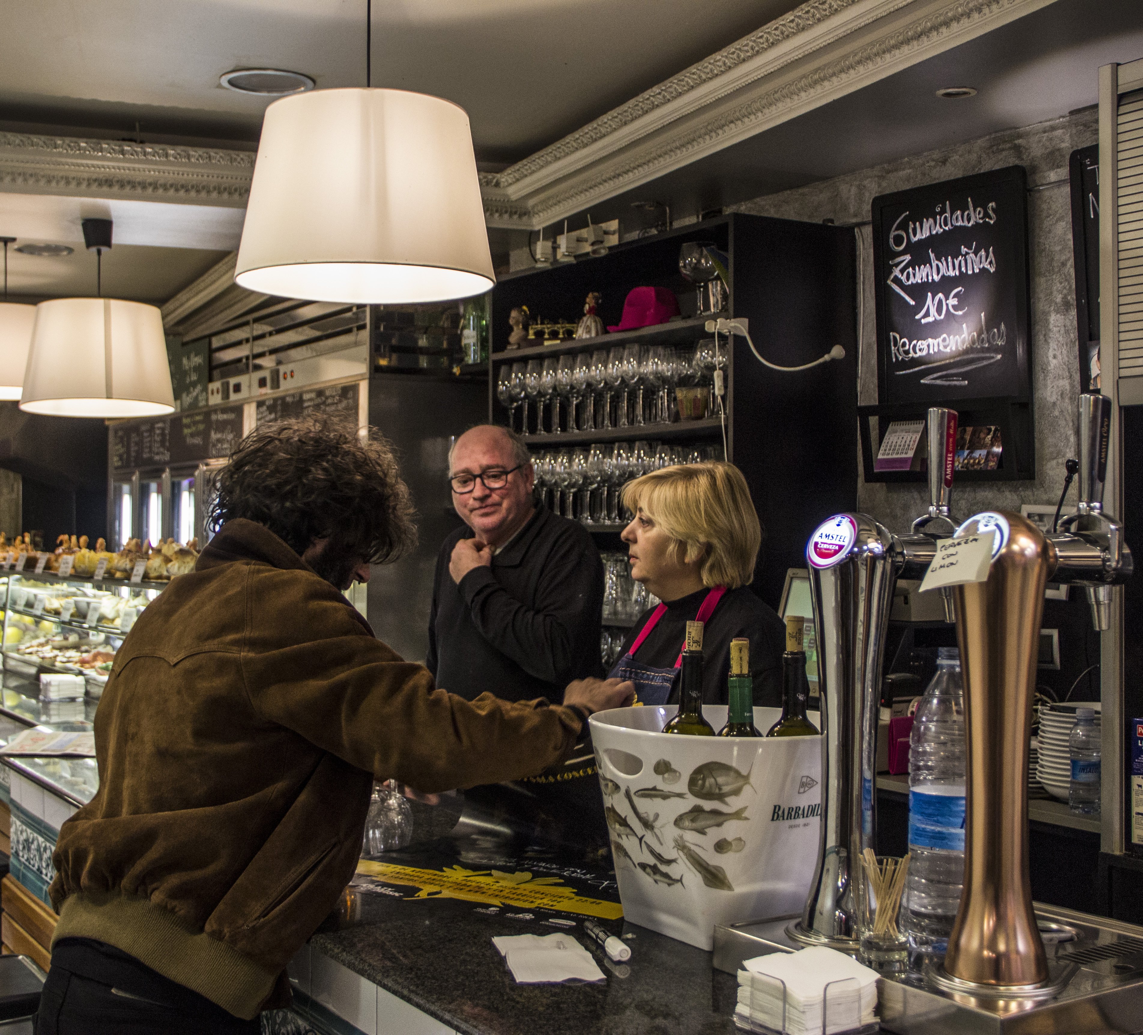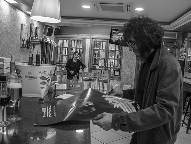 Ya en la calle San Juan, la primera parada es en la tienda de discos ‘Re-loop-Shop’, donde Messura realizó la presentación de su disco ‘Animal’ hace tan sólo unas semanas. Allí Alicia Rodríguez y Daniel Pérez, sus propietarios, se unen a la degustación de unas cazuelitas y unos crianzas -también alguna cerveza- en el ‘A tu gusto’. Mejillones al vapor, Ajoarriero y Bacalao a la Riojana. Desde detrás de la barra solicitan a Diego un cartel firmado del concierto y el cantante de Messura acude solícito en busca de uno y estampa su rúbrica. Hay complicidad y cariño desde ambos lados de la barra e infinitos buenos deseos de cara a la noche.