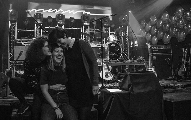 Son las ocho de la tarde. Toca un receso. A las nueve y media la sala abre las puertas y el público comienza a entrar. En los camerinos se percibe la tensión de los momentos ilusionantes, cada uno la rebaja como puede. En el sofá central Diego; Germán y Joselú charlan con Sara, Irene y Marta. Justo enfrente, en un segundo corrillo, David Burgui comparte cervezas con Rubén Domínguez -manager del grupo- Daminán, responsable del sello ‘Entrebotones’ y Silvia Cantero, de Cuestión de Medios, encargada de mover a Messura entre los medios de comunicación de la capital.
