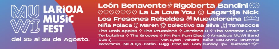 Los festivales de verano arrancan y MUWI La Rioja Music Fest viene cargado de cultura, vino y gastronomía, desde ayer viernes, 24 de junio, se conoce el cartel completo por días con todos los artistas de su sexta edición. Desde el jueves 25 hasta el domingo 28 de agosto, Logroño será el epicentro de la música acompañada de buen vino y gastronomía: Rigoberta Bandini, León Benavente como cabezas de cartel, que vienen de encadenar varios sold-out, junto a La La Love You, Lagartija Nick, Maren, Mueveloreina, The Crab Apples, Terbutalina, The Monster Lover, Niña Polaca, Panoramis, /Göo!, The Prussians, Los Fresones Rebeldes, Jordana B., Colectivo Da Silva, The Grooves, Tomaccos, Amadeus MUWI Band, Pin Pan Pum Disco desplegarán cultura en los principales escenarios: El muro del Revellín, Bodegas Franco-Españolas y La Laurel. Será una jornada en abierto y 3 de abono.