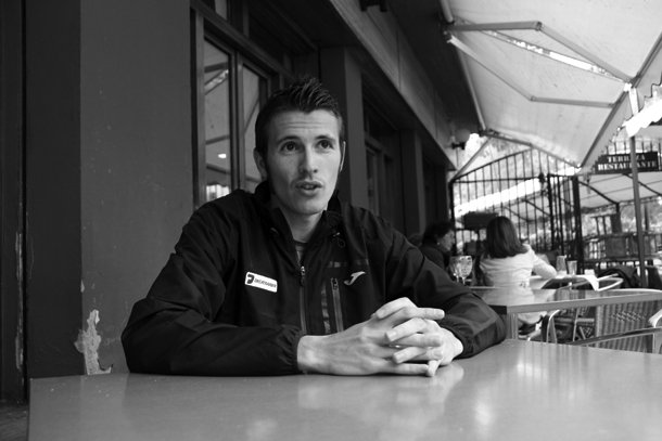 Roberto Briones llega al 'Rincón de Julio', la terraza situada a tan sólo unos metros de las pistas de Atletismo del Adarraga con el botellín de agua en la mano. Está cansado, pero satisfecho. Hoy tocaban series; de 450 y 300 metros. "Las primeras se me han hecho largas, pero luego he ido entrando y han salido muy bien". Roberto está contento, está entrenando bien y tiene buenas sensaciones. Antes de que la grabadora se ponga en marcha ya está hablando de atletismo. No esconde que le encanta su deporte, no en vano además de competir en los 400 metros es también el presidente de la Federación Riojana de Atletismo. Desde ese punto de vista lamenta la falta de un referente como fue Carlota Castrejana, pero también observa con ilusión las más de mil licencias existentes a nivel de deporte base. Además, piensa también en el día en que sus piernas le avisen de que ya no les apetece completar el anillo de la pista de atletismo en busca de una mejor marca. Por eso estudia Administración y Dirección de Empresas y ya ha dado sus primeros pasos con la puesta en marcha de Decatrainer. ¿Sus objetivos personales? El Campeonato de España al aire libre y el Mundial de Moscú. Roberto Briones formó parte del relevo que consiguió la mínima en Roma el año pasado para participar en el Mundial y no quiere perderse la cita. "Ya he estado en un Europeo, pero nunca en un Mundial"./Javi Muro.