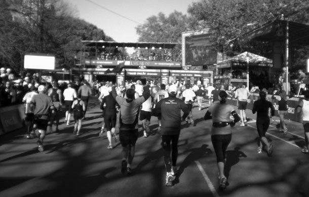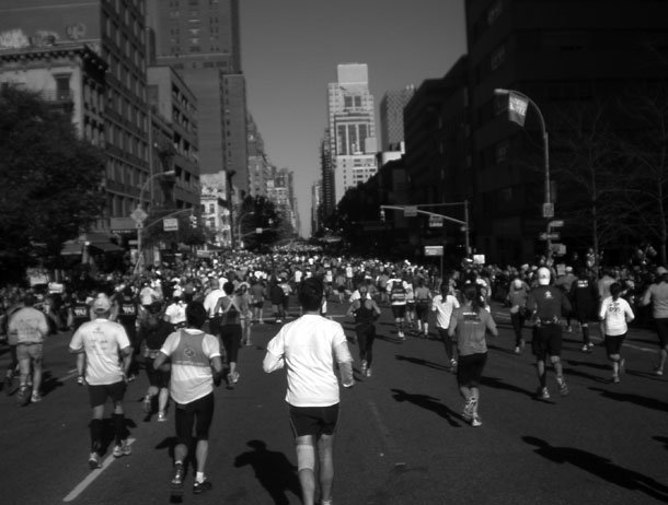 No siempre Staten Island y el puente Verrazano fueron el inicio de la carrera. El primer maratón de Nueva York se disputó en 1970 y discurrió alrededor de Park Drive, en Central Park. Entonces, aquellos primeros 127 participantes dieron vueltas a un circuito ante la mirada de poco más de un centenar de espectadores.Es 7 de noviembre de 2010, en el maratón están inscritos 40.000 corredores y en cada centímetro del recorrido hay miles de espectadores. Hoy es día fiesta en Nueva York, el maratón se celebra con orgullo en la ciudad. Van a dar las nueve y ya estamos preparados. Por delante salen Gebreselasi y sus amigos; algunos estarán de regreso en sus países para cuando los demás lleguemos. Cuando les veo ejecutar esas zancadas tan elegantes pienso que practicamos deportes diferentes. Tengo que confesar que algunas veces, en otras ciudades con menos público en los kilómetros intermedios, me he guardado algunas gotas de energía para tratar de correr los últimos kilómetros con cierta clase, acercándome a meta cuidando cada zancada –modo keniata- que piensen que soy un tipo elegante, aunque el vencedor me haya sacado más de una hora y media. En Nueva York no hay reserva estética de fuerzas que valga, hay gente en cada centímetro, así que el estilo forjado en los parques del Ebro, La Ribera y el Iregua queda desvelado desde el primer kilómetro.