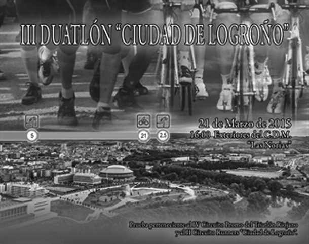 El III Duatlón ‘Ciudad de Logroño’ se celebrará el próximo sábado 21 de marzo y propondrá 5.000 metros de carrera a pie, 21,2 kilómetros sobre la bicibleta y 2.500 metros finales, de nuevo, sobre las zapatillas. La prueba es la primera de las 17 incluidas en el Circuito Running 2015 y forma parte también del IV Circuito Promo del Triatlón Riojano.