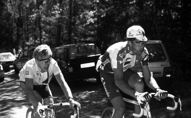 Aquel Giro de 1994 lo ganó Eugeni Berzin, un ruso enrolado en el equipo Gewiss que ya había logrado aventajar a Indurain en dos minutos en la primera contrarreloj de aquella carrera. Berzín llegaba avalado por su victoria en la clásica Lieja-Bastogne-Lieja, pero con el hándicap de haber ocupado el puesto noventa en el anterior Giro. En medio de la batalla entre el español y el ruso había aparecido un ciclista flacucho llamado Marco Pantani, que se había anotado la victoria en la etapa de montaña que precedía al paso por Aprica y la llegada al Mortirollo.Lo cierto es que aquella fue una muy dura etapa. Previa a la ascensión a Aprica, los ciclistas tuvieron que superar el Stelvio, Valico de Santa Cristina y Mortirolo. Fue en el descenso del Stelvio donde atacó Chiapucci, pero las fuerzas no le dieron para mucho –el valiente corredor italiano daba ya sus últimos coletazos en el pelotón- y fue superado en el ascenso del Mortirolo por su joven compañero de equipo, Marco Pantani. Tan sólo Berzin –la maglia rosa- fue capaz de seguir su rueda. Resultó ser un espejismo y tan sólo unos kilómetros más arriba el ritmo del escalador italiano reventaba al ruso. Indurain a su paso superaba al líder de la general y, todo parecía indicar, que se encaminaba hacia su tercer Giro. En la cima del Mortirolo, Pantani aventajaba en 50 segundos a Indurain y ‘Cacaito’ Rodríguez a los que espero en la bajada para afrontar juntos el tramo llano que llevaba hasta las primeras estribaciones del puerto de Aprica. La ventaja sobre el ciclista ruso se aproximaba a los dos minutos.