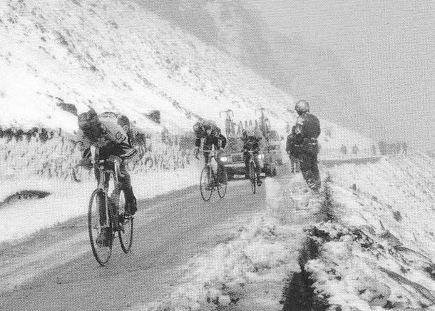 Mientras los ciclistas pedalean por las pendientes del Gavia contemplan el pasillo formado por paredes de hielo que les acompaña desde las laderas. La idea de pelotón tal y como lo conocemos hoy no existía, los ciclistas comenzaban a desperdigarse en pequeños grupos, muchos abandonados en solitario a merced de la primera glaciación ciclista.