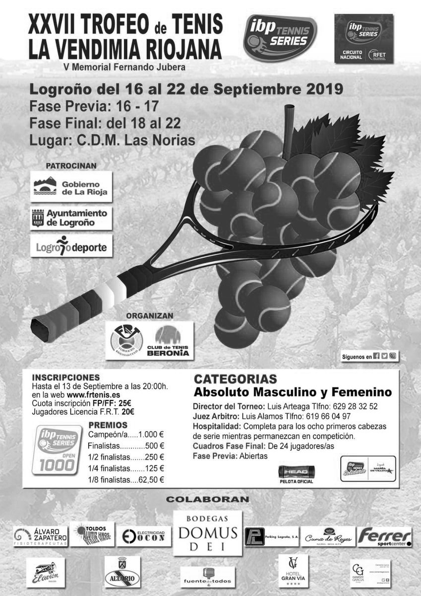 El Trofeo de Tenis de la Vendimia Riojana se celebrará en Las Norias la semana próxima, del 16 al 22 de septiembre, y cumple su XXVII edición –V Memorial Fernando Jubera- con importantes novedades derivadas de la incorporación al Circuito IBP Tennis Series. Así lo presentón el concejal de Deportes, Rubén Antoñanzas, acompañado por presidente de la Federación Riojana de Tenis, José Luis Terroba. El torneo es ya, un evento deportivo consolidado en los días previos a las fechas de San Mateo.