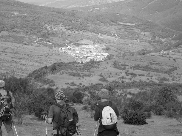 Estamos en uno de los pueblos más auténticamente cameranos, de larga y rica tradición y enorme hermosura. Desde la iglesia, tomamos la calle principal para dejarla al poco por su izquierda y descender hasta el Arroyo del Valle por un camino entre los bardales que limitan los prados. Luego, el ascenso continuado siguiendo marcas de uno de los senderos del Parque Cebollera nos lleva al despoblado de El Hoyo.
