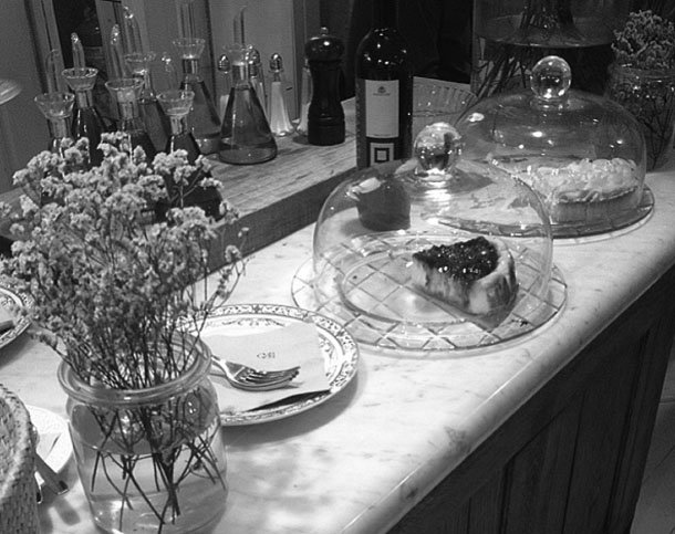 Mesas de madera decoradas con plantas, jarrones de paniculata, y su candelabro. Las lámparas son de lo más original. Unas con forma de pamelas preciosas, otras de madera, de cristal, cestos de mimbre … Todo en tonos blancos lo que hacen que sea un local muy luminoso. Al fondo, justo delante de los espejos que se abren para dar entrada a la cocina se sitúa un mostrador de madera con la encimera de mármol blanco con algunas de las tartas de la carta expuestas. En la pared de la izquierda, al fondo, una zona de espejos por la que se accede a un elegante salón de paredes de madera blanca. Aquí se mezclan objetos vintage y modernos. Cuadros con esos marcos dorados rococo de paisajes que no faltaban en casa de nuestras abuelas ocupan las paredes laterales.