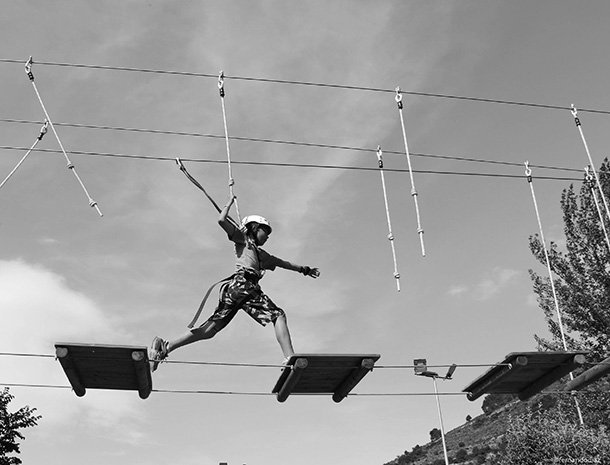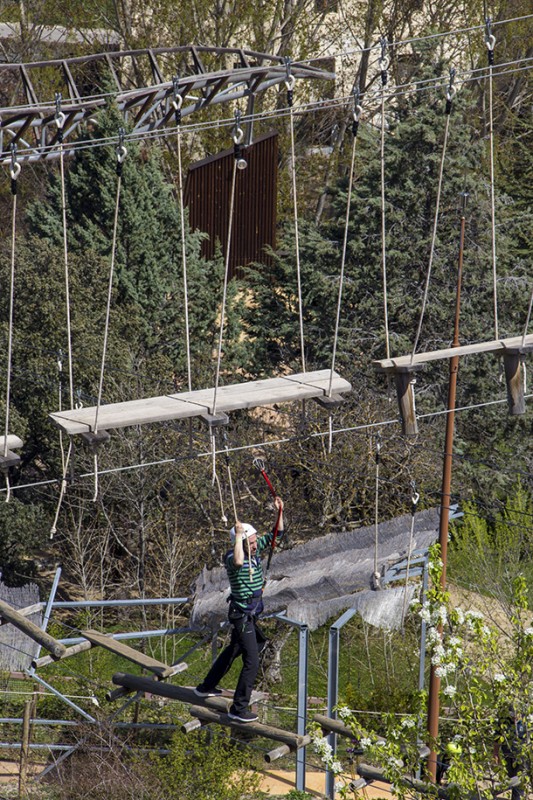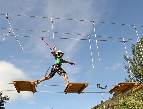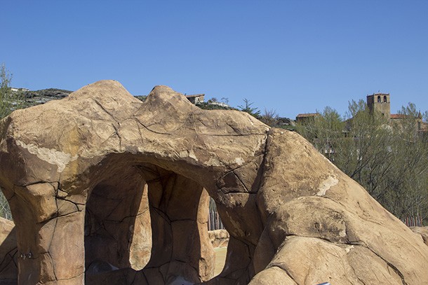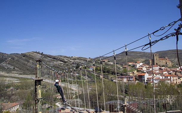 Pero como todo el mundo sabe, llegar hasta un yacimiento que esconde una parte de la historia pasada del planeta implica vivir toda una aventura. En El Barranco Perdido sucede de igual manera. Así, el Circuito Multiaventura reta al visitante a ascender la Colina Encantada a través de puentes tibetanos y de equilibrio, tirolinas y toboganes. La ruta de ascenso -que permite observar el valle, las montañas limítrofes, el pueblo de Enciso que conforme vamos adquiriendo altura va situándose a la misma altura que nuestros ojos y la espectacular barrera que forma la pared principal de la presa- cuenta con un trazado con una veintena de juegos de puentes, pasarelas, redes y obstáculos de paso. Una vez alcanzada la cima las opciones se multiplican. Siguiendo la pista que nace junto al mirador en el que desemboca el último de los puentes volados se llega a los yacimientos de icnitas. Si la opción es el descenso, el tobogán te ofrece una vertiginosa bajada hasta la plaza central del parque. Si el visitante quiere disfrutar de las vistas comprobará que El Barranco Perdido se ha construido sobre una superficie de 14.000 hectáreas, siguiendo la misma estructura de terrazas sobre la que levanta justo enfrente el pueblo de Enciso.