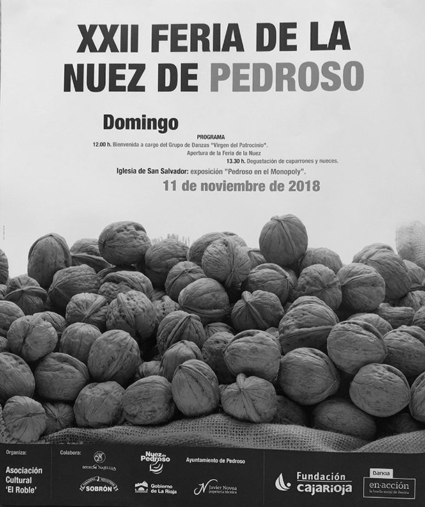 La localidad riojana de Pedroso celebra el domingo 11 de noviembre la XXII Feria de la Nuez. La iniciativa, organizada por la Asociación Cultural El Roble desde 1997, reúne cada año a más de 3.000 visitantes y permite degustar sus características nueces y recorrer los 22 puestos con productos caseros y artesanales derivados de la nuez (sobadas, licores, mantecados). Además, este año como novedad la feria acoge la exposición 'Pedroso en el Monopoly', creada con motivo de la casilla conseguida recientemente en este popular juego de mesa.