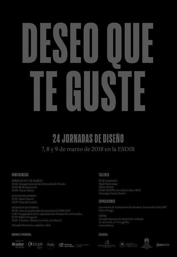 Las XXIV Jornadas de Diseño de La Rioja se celebrarán del 7 al 9 de marzo en el Salón de Actos de la Escuela Superior de Diseño. Durante estos tres días, La Rioja contará con destacados ponentes de carácter internacional de las más variadas disciplinas, como representantes del estudio de arquitectura RCR, galardonado con el premio Pritzker, el más importante galardón del mundo en el campo de la arquitectura, y Oscar Mariné, Premio Nacional de Diseño. Las jornadas se dirigen al público en general y son de carácter gratuito.