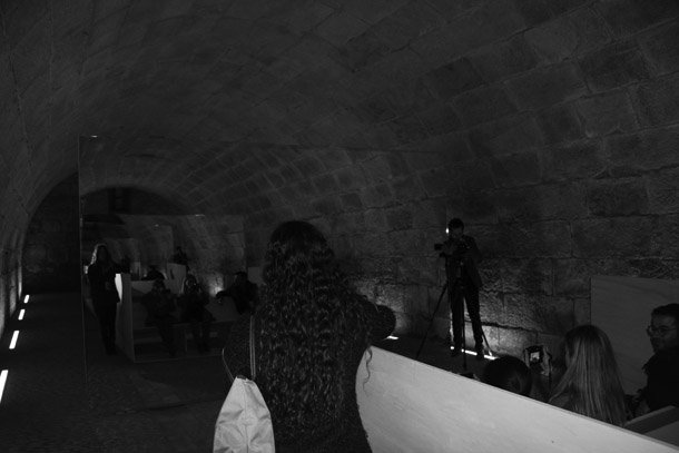 Cuarenta años más tarde, la rehabilitación llegó al Calado de San Gregorio, situado a tan sólo unos metros de la comisaría. Una bodega subterránea, como las innumerables que ocupaban el subsuelo de Logroño en el S XVI, construida en sillería. El calado de San Gregorio es conocido también como ‘el calado largo’, por su longitud de treinta metros y cuatro metros y medio de anchura. Joao Branco y Paula del Río quisieron, al descubrir tan maravilloso espacio, convertirlo en infinito. Ahí surge, ‘En el túnel’, una intervención que incita a adentrarse en un espacio infinito. Una vez dentro, se mire a donde se mire, el calado se extiende y se multiplica. Nos podemos contemplar en el interior de la Historia y la tradición de la ciudad.