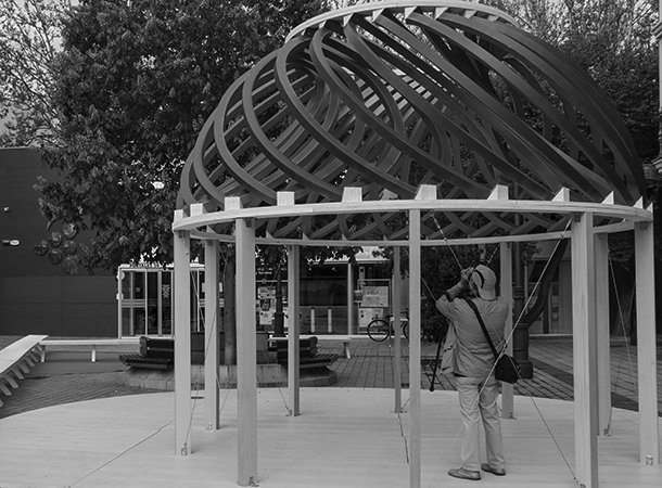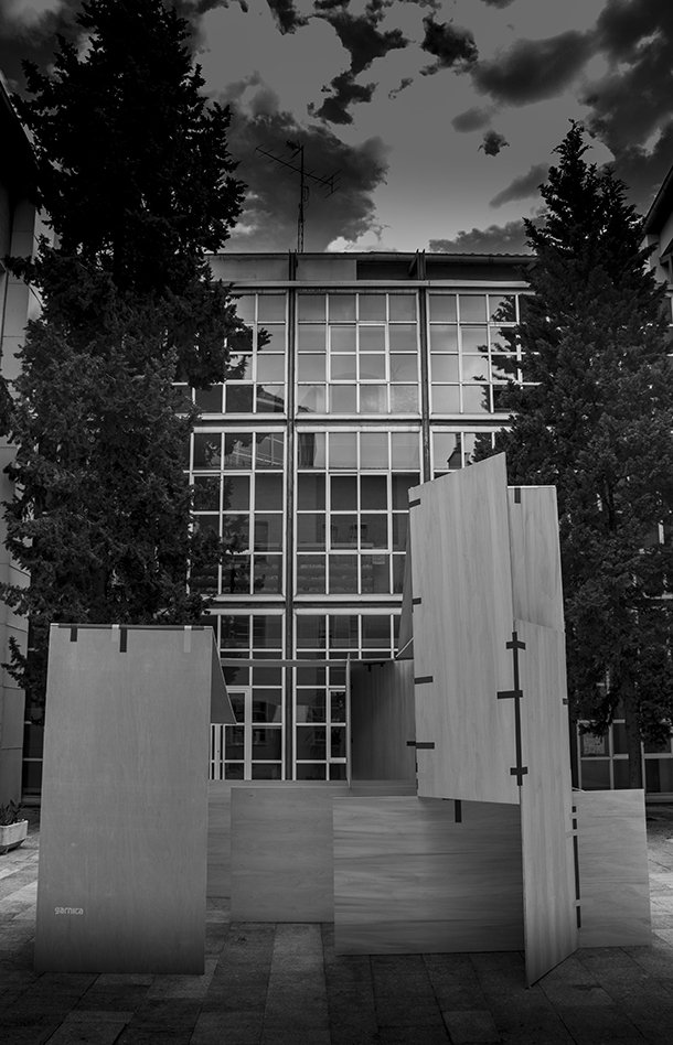 La Chabola es un ejercicio arquitectónico, una investigación sobre la capacidad de crear espacios con la interacción de 20 tableros de madera sin realizar uniones fijas. Inspirado en el uso de las cintas de kinesiología.