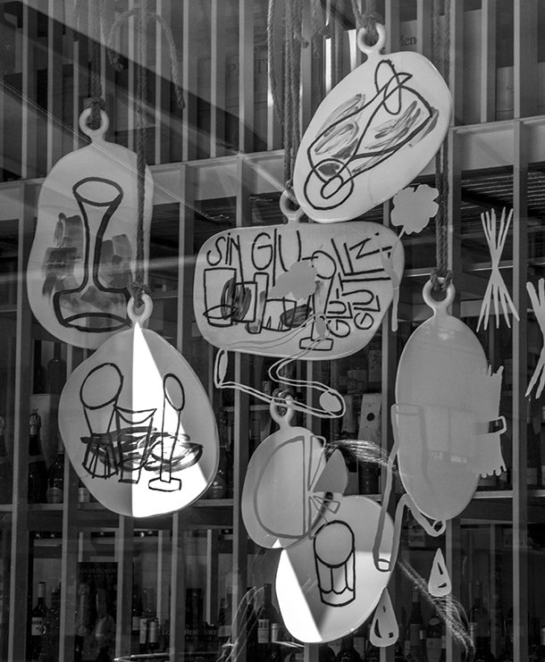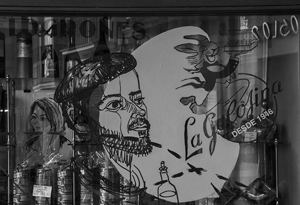 La Golosina es comercio tradicional, de toda la vida. En la cristalera que recorre su escaparate en ‘V’ residen ahora los vecinos de la ciudad, retratados durante largas jornadas de dibujo. Llevan la firma de Elena San Miguel y su técnica de no levantar el rotulador de la superficie, “porque la vida misma es así, un juego de errores cuyo camino crea el mapa que no había al principio. No se puede deshacer el camino recorrido, pero se puede iniciar otro diferente”.