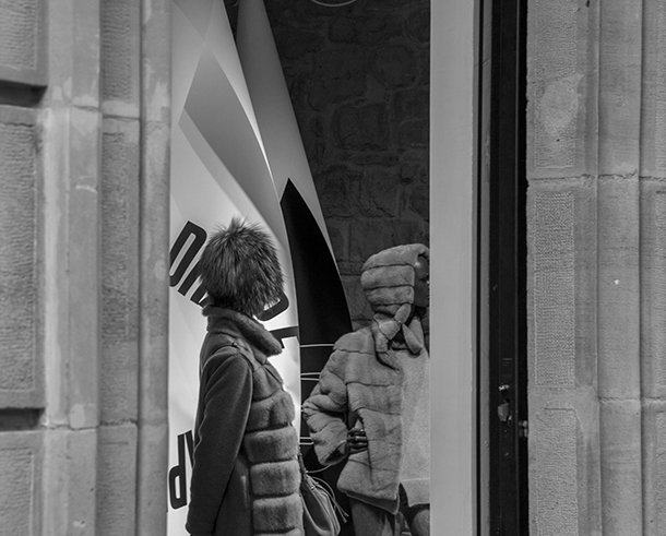 La perfecta iluminación de LDM Moda acoge las luminarias escultóricas de Óscar Rubio. Capas narrativas que protegen y resaltan, que dotan de emociones a los inertes maniquíes. Movimientos delicados como los sugeridos por Patricia Roche para degustar los dulces de Pastelería Manolo Iturbe. Ventanas circulares que invitan a acercarse suavemente, persiguiendo el detalle del dulce elegido. La acción se transforma en quietud en Mikonos. ‘Detrás de la cortina’ proponer descubrir, revelar, encontrar, destapar. ¿Qué sucede detrás de la cortina? El vestuario como elemento principal. ¿Qué sucede detrás de la cortina mientras nos probamos ropa y en privado nos vamos transformando? Una conversión que en ocasiones también tiene que ver con la escala y la percepción, con llamar la atención, en definitiva. Así sucede en Óptica Cadarso. Sensaciones, los sentidos en ebullición como las ilustraciones de Lander Rekakpetxea que invitan a adentrarse en Vinoteca Larría.