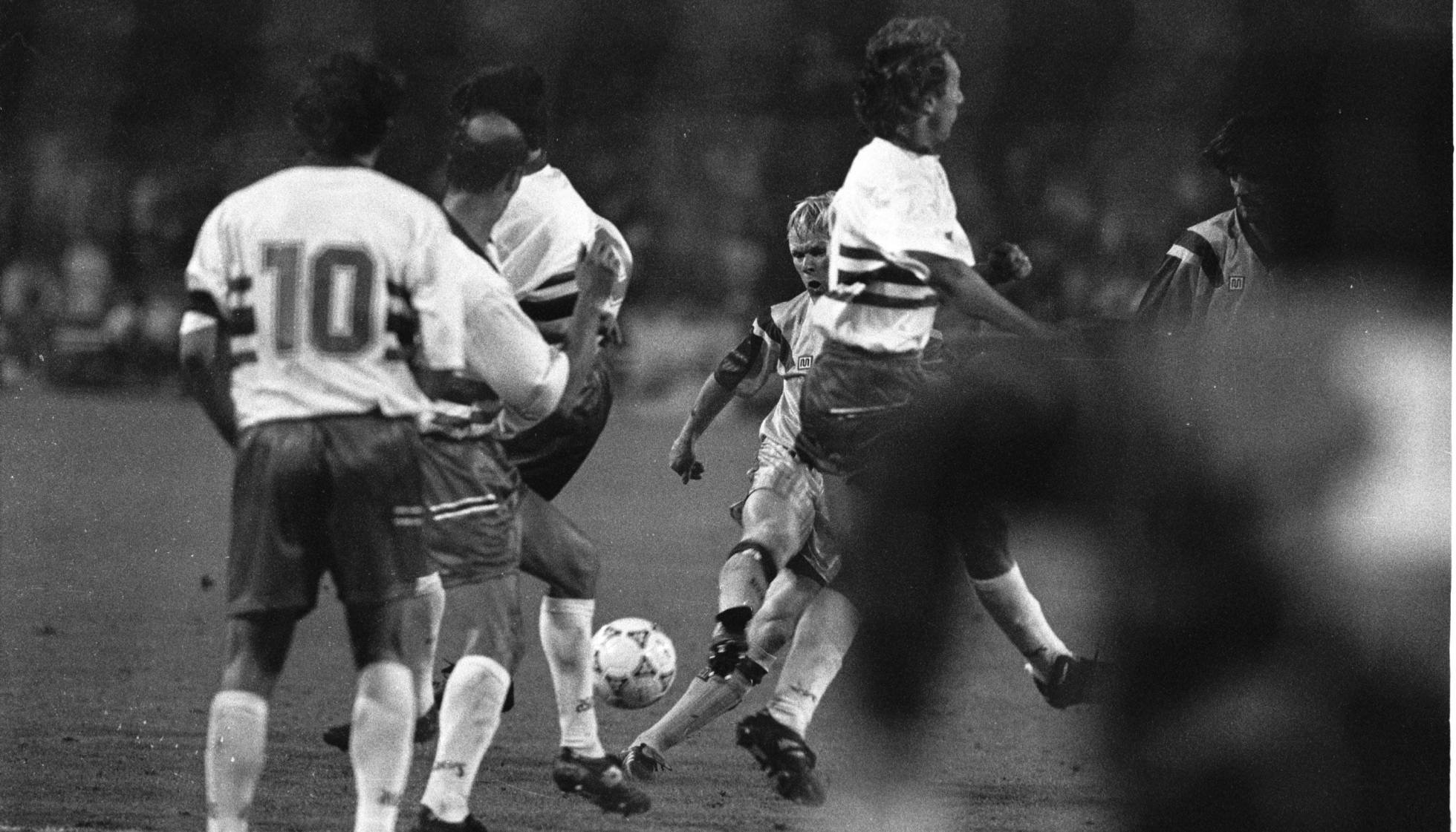 La fotografía del gol de Koeman está hecha con teleobjetivo. Cuando llevas mucho tiempo haciendo fotografía de deporte, de fútbol sobre todo, te levantas y vas detrás de la portería para ver si haces alguna fotografía. La imagen del gol de Koeman parte de una falta directa con barrera. Era una fotografía en analógico. Cuando Koeman chuta se abre la barrera que formaban los jugadores de la Sampdoria y disparo tres fotogramas clak, clak,… chak –siempre realizaba tres disparos- y la del medio solía ser la buena. Al enviarlas al periódico les dije que miraran esas fotos porque creía que se veía la pelota al salir de la bota de Koeman.