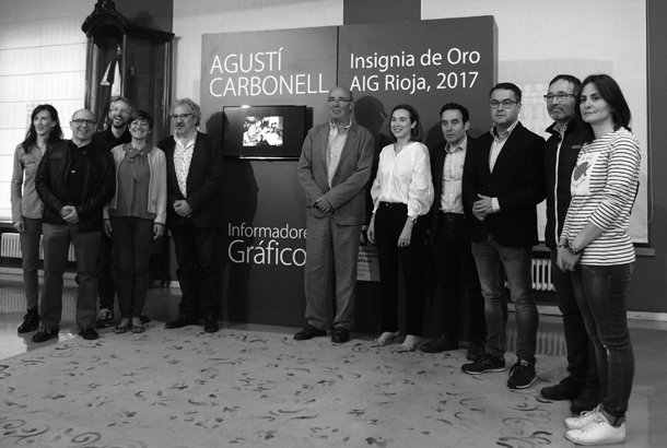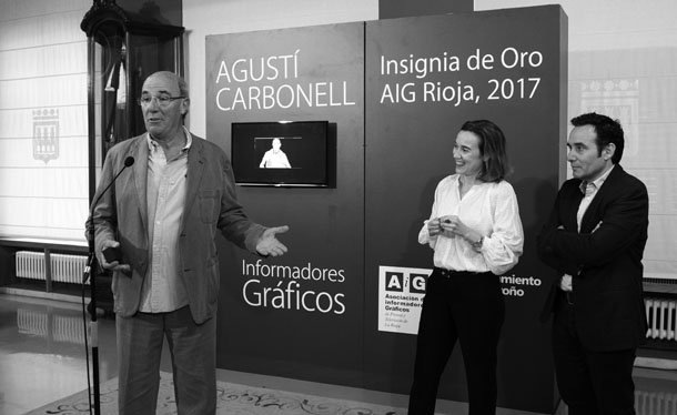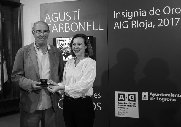 * La entrega de la Insignia de Oro de la Asociación de Informadores Gráficos de La Rioja a Agustí Carbonell tuvo lugar en el Salón de Retratos del Ayuntamiento de Logroño. La alcaldesa de Logroño, Cuca Gamarra, y el presidente de AiG, Fernando Díaz, hicieron entrega del galardón, acompañados por varios compañeros fotoperiodistas, así como por la concejala de Cultura, Pilar Montes, y el concejal de Alcaldía, Javier Merino.