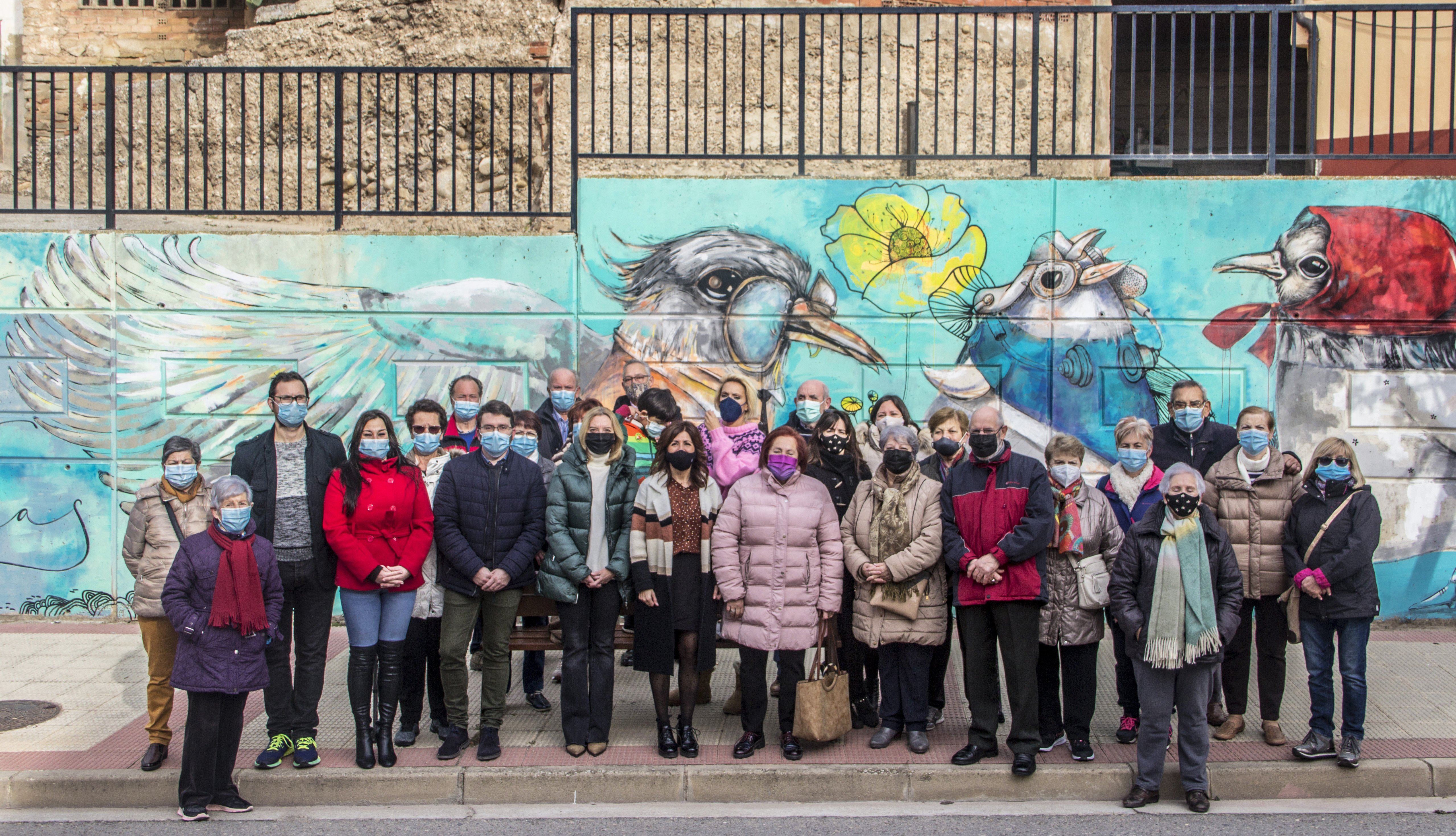 El Ayuntamiento de Villamediana de Iregua ha inaugurado hoy sábado, 20 de noviembre, el mural homenaje a las personas mayores del municipio. La obra, de 20 metros de longitud, recorre ya el medianil de la calle Cameros, a la altura del número 22. La alcaldesa de Villamediana, Ana Belén Martínez, ha resaltado que “a través de este mural, Villamediana reconoce la labor esencial de las personas mayores en el municipio”. Al acto han asistido medio centenar de vecinos de la localidad, protagonista la mayoría del reconocimiento expresado a través de la obra de arte urbano. Martínez ha estado acompañada por la directora general de Dependencia del Gobierno de La Rioja, María Somalo, y los concejales Enrique San Román, Ana Isabel Román Puerta y Pedro Lorenzo, y ha destacado “la vida dedicada a Villamediana, su aportación constante al día a día, y su implicación y colaboración para revertir los momentos más complicados de la pandemia, aún siendo una de las poblaciones de mayor riesgo”. La alcaldesa ha apuntado que el “mural representa la gratitud de todos los vecinos de Villamediana hacia las personas mayores de la localidad” y les ha invitado “a continuar participando para hacer de Villamediana cada día un lugar mejor”.