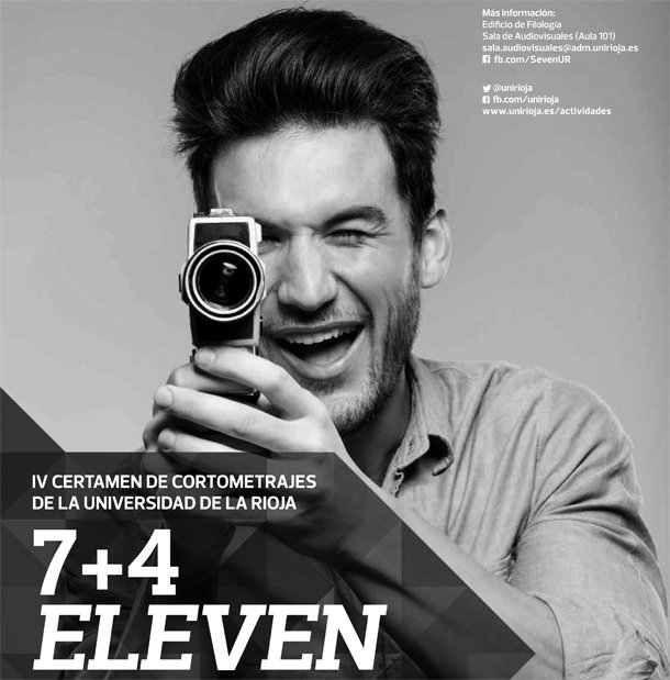 La Unidad de Audiovisuales de la Facultad de Letras y de la Educación, y la Asociación Cinematográfica y Audiovisual de la Universidad de La Rioja han convocado el IV Concurso de Cortometrajes 7+4: Eleven. La elaboración del guion, el rodaje y la edición deberán llevarse a cabo durante los once días comprendidos entre el 11 de abril y el 22 de abril; ya que la organización da el tema, texto, personaje, género, estilo y/o técnica al inicio de la competición y los participante proponen el resto, en español o en inglés.