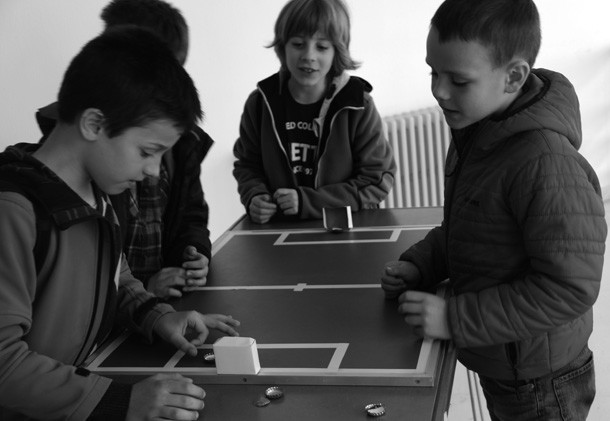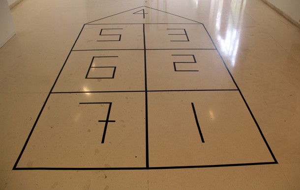 La exposición reúne una cuidada selección de entretenimiento que demuestra cómo antes de la era digital, los niños también sabían divertirse con los recursos que tenían a su alcance. Sobre el suelo de la Sala está silueteado un juego del Cazo. Un grupo de niños lanza, sobre lo que en las calles y plazas era clarión, una piedra simulada y a la pata coja trata de arrastrarla siguiendo los números situados en cada vértice./Javi Muro
