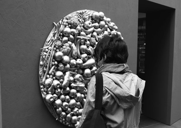 Sumamos una calle en paralelo a nuestro paseo y desembocamos en Jorge Vigón. En el estudio de decoración Cocinamos ha intervenido la fotógrafa y gestora cultura Laura Peña. ‘Somos’ es su propuesta, un proyecto fotográfico, que vincula las artes plásticas con el carácter del comercio en el que se exhibe. La intervención está formada por siete composiciones fotográficas que representan a cada uno de los grupos de alimentos: queso, huevos, nueces, pimiento, plátanos, pan y cruasán. “Los alimentos han sido descontextualizados de su textura original con una nueva piel compuesta por pan de oro fino de 22 quilates que otorga a cada uno de ellos un nuevo valor potenciando su interés como un bien preciado. Esta cualidad concede a los alimentos un fuerte componente ornamental que se desarrolla en las fotografías a través de la vinculación que establecen con el cuerpo humano”. Somos lo que comemos, que dijo el filósofo alemán Feuerbach.