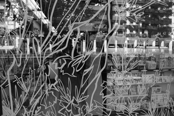Si continuamos por la acera sur de la Gran Vía en sentido este, reconocemos el trazo de los dibujos del ilustrador riojano Javier Jubera sobre el escaparate de la librería Santos Ochoa. La intervención se denomina ‘Family Tree’ y Jubera se explica. “Al intervenir en la librería Santos Ochoa –describe- la idea es plantar un bosque en el centro de la ciudad. Las librerías tienen libros, los libros son de papel, y el papel viene de los árboles, así que me parece perfecto homenajear estos bosques y concienciar con esto el buen uso de esta materia prima tan importante”. Añade el artista gráfico que el título de la obra –que tiene su continuidad en el interior- hace referencia a Santos Ochoa puesto que es un negocio familiar y por supuesto a los elementos naturales que tan necesarios me parecen, árbol, bosque, familia”.