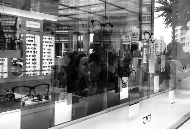 Sin variar el rumbo alcanzamos la óptica Caro Cánovas. En su escaparate seis fotografías parecen, desde la distancia, desenfocadas. La serie de imágenes, realizada por Asier Rua, se titula ‘Una aproximación’ e incita a quien las observa para tratar de encontrar la nitidez. “Es una invitación a aproximarse a ella, entrando y descubriendo a qué espacios pertenecen las fotografías, y así poder tener tu propia experiencia del lugar”. Dice Asier Rua que en su experiencia como fotógrafo de interiores descubre “siempre las imposibilidad de fotografiar los espacios de una manera fiel, hay siempre una mirada particular, como la hay también en la propia experiencia que cada uno tenemos al contemplar o visitar un espacio. Las imágenes, al final, terminan siendo una aproximación de lo que ese lugar es”.