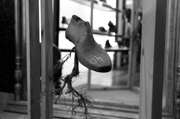 Un nuevo callejeo a la derecha nos lleva por la peatonal García Morato hasta la zapatería Trece Marmotas. Allí Carlos Villoslada encontró una tienda elegante que sugería una propuesta potente a la vez que sutil. Así surgió ‘Bajo tus pies’. De los zapatos creados por Villoslada crecen raíces. “Quería hablar –detalla- de las huella que vamos dejando y de la sensación de querer permanecer en la tienda”…. “Bajo tus pies, mis huellas, Bajo mis huellas, un sendero, Bajo el sendero, el manantial. Todo camino se traza desde lo más profundo, nace de la parte interna y va hacia el exterior, se nutre y brota, se encauza y camina. Bajo tus pies nos invita a observar la parte íntima de nuestros pasos, el camino que trazamos hasta llegar a nuestros objetivos. Antiguas hormas que sirvieron de medida a quien calzó nuestros pies, ramas que representan el alcance de nuestras zancadas, nidos que muestran cuales fueron nuestros pasos más comprometidos, o raíces que nos dicen los que fueron en busca del manantial”.