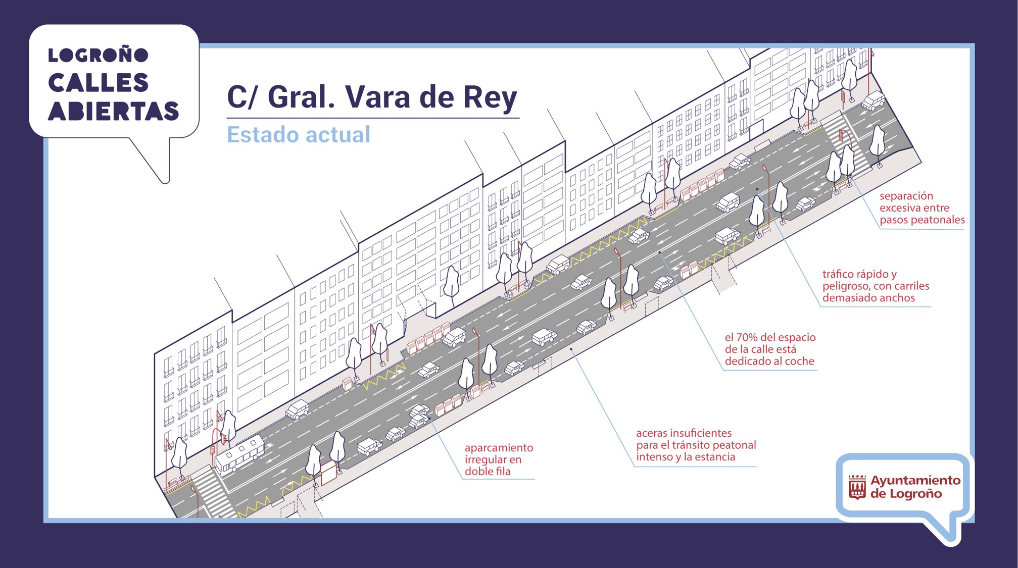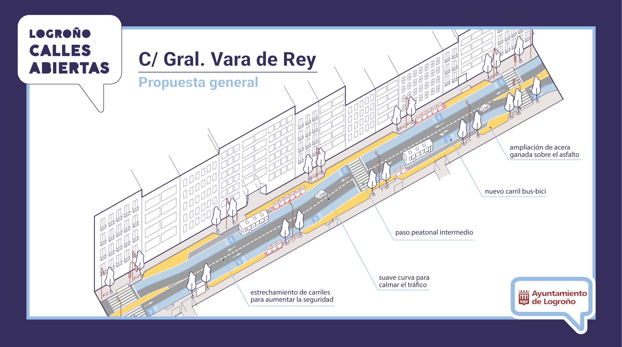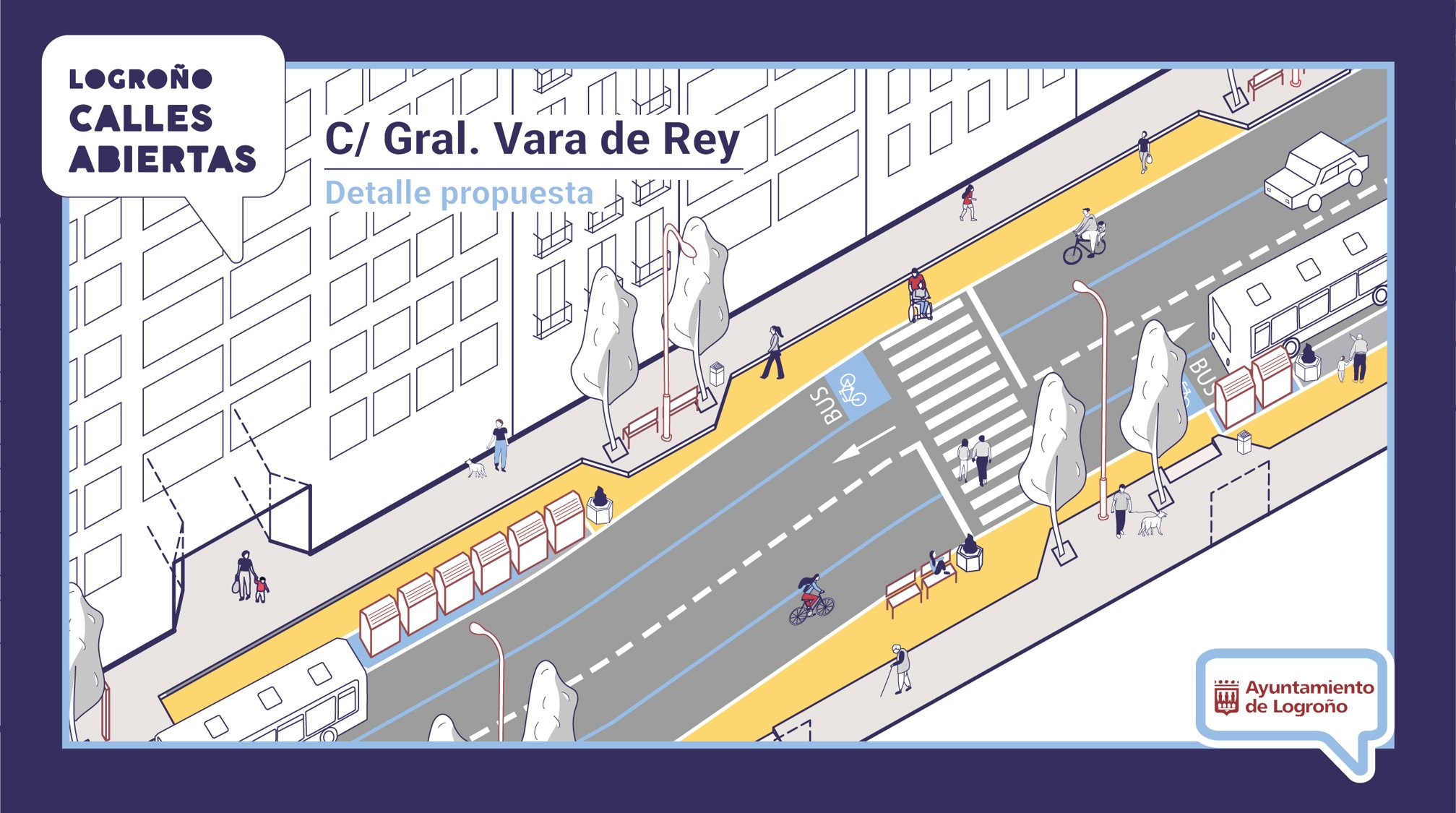 La calle Vara de Rey, en el tramo comprendido entre la calle Huesca y Gran Vía, ganará un total de 1.600 metros cuadrados para el disfrute de los peatones y contará con el primer carril-bus de Logroño. Así lo ha anunciado el Ayuntamiento de Logroño. La actuación se enmarca en la estrategia 'Logroño calles abiertas', cuyo objetivo fundamental es adaptar el espacio público para fomentar una movilidad sostenible, segura y saludable.