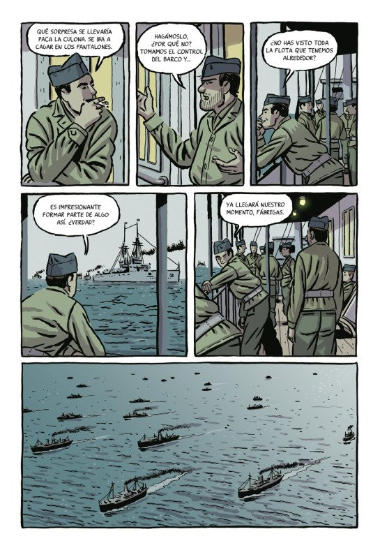 Era un reto dificilísimo contar la historia de la Nueve sin enredarse en el mito. Roca lo ha resuelto utilizando el color como un recurso narrativo, mezclando los grises del presente con un pasado en color, también en varias tonalidades, para diferenciar la luz del desierto africano de la primavera inglesa o el verano francés. Con su narración cinematográfica, ha creado una película que ya no hace falta rodar. Cada viñeta es un plano y ninguno es innecesario. Lo mejor es que el retrato de Roca del presente del anciano es tan interesante como la aventura del joven.