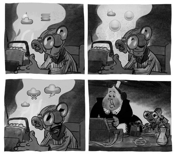 Del altavoz de la vieja radio brotan nubes blancas y soles relucientes. Su luz ilumina la cara del miope pescador, hasta que el locutor cuenta cómo a mediodía la tormenta vencerá al sol y las nubes negras tuercen su sonrisa en un gesto de pesadumbre. Aún en pijama, Monsieur desayuna la crepe recién hecha por su esposa, preocupado por el mal tiempo que le espera en el mar. Es una rutina que intuimos repetida desde hace décadas en este matrimonio sin hijos. Con cuidado, la mujer –yo quiero creer que se llama María, como el barquito que espera al pescador en el puerto– guarda en la tartera un puñado de latas de sardinas, indiferente a que a su marido las odie. La jornada, en fin, promete la seguridad de los días iguales, pero la gran aventura muda comienza nada más zarpar.
