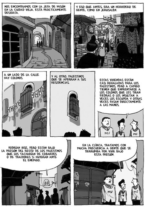 “Esta región es agotadora”, le dice Sébastien, un empleado de la Alianza Francesa, a Guy Delisle en uno de los muchos viajes a través de los checkpoint que trocean Jerusalén. Y ciertamente lo es para el lector, que camina por la ciudad tres veces santa a través de las viñetas de Delisle, con la mirada sorprendida de un católico madurado en ateo que descubre una ciudad trofeo y fortaleza. A Delisle le fascina el muro de láminas de hormigón y torres de castillo medieval que domina el horizonte y una y otra vez acaba dibujando lo que ocurre en los alrededores de esta barrera levantada para impedir atentados terroristas y que ha partido la vida de centenares de miles de palestinos.