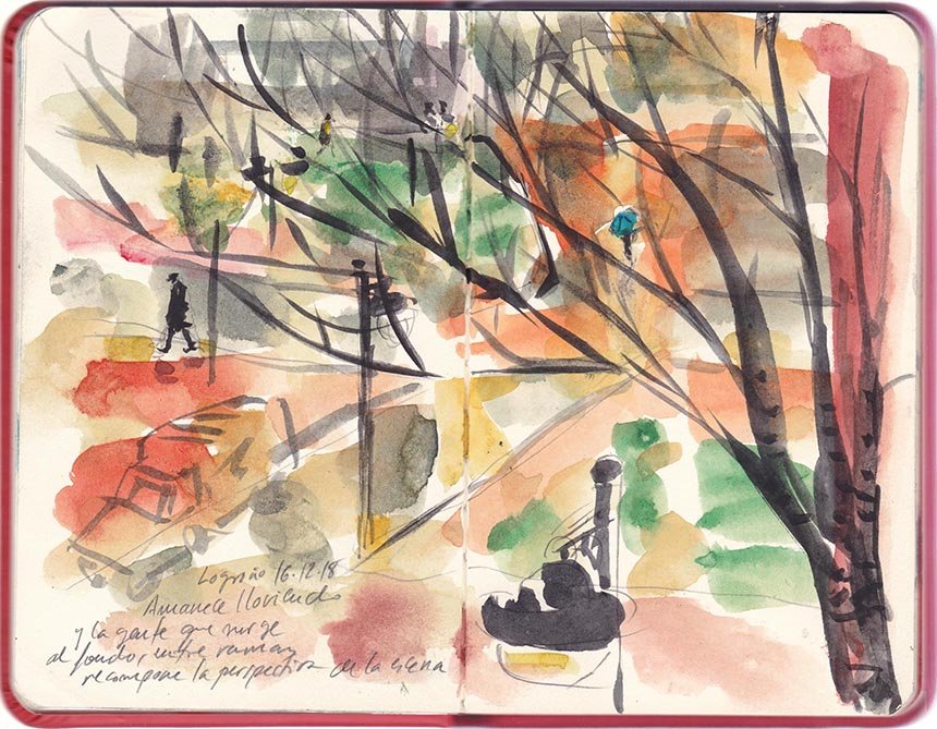 Amanece lloviendo y la gente que que surge al fondo, entre las ramas, recompone la perspectiva de la escena.