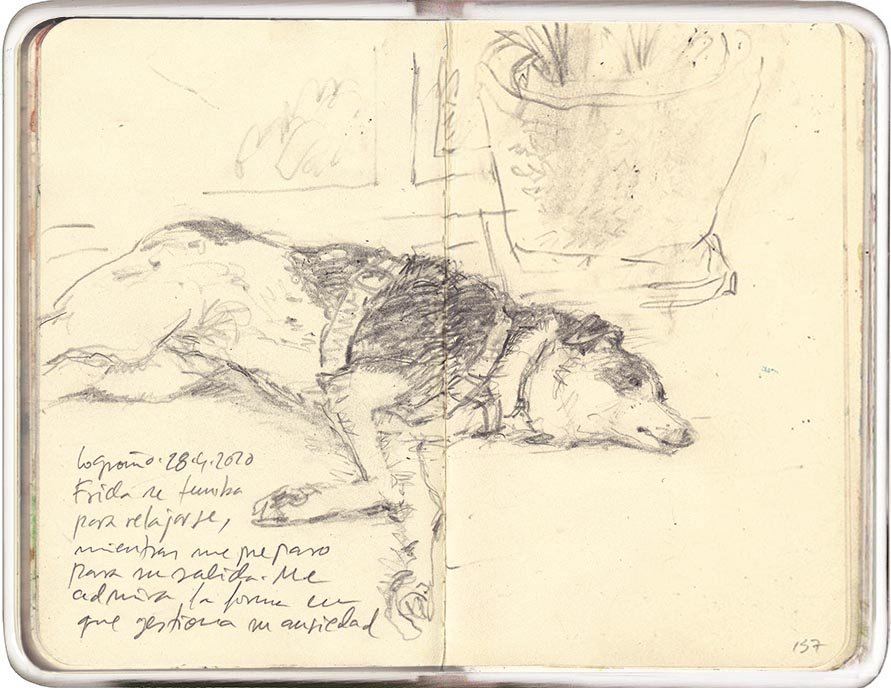 Frida se tumba para relajarse, mientras me preparo para su paseo. Envidio su forma de gestionar la ansiedad.