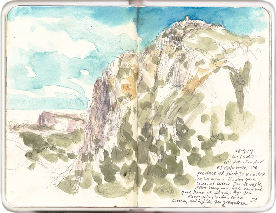 El lado este del mirador Es Colomer no produce el vértigo seductor de los acantilados que caen al mar por el oeste, pero hay una roca enorme que llena el alma. Aquella torre diminuta en la cima, certifica su grandeza.