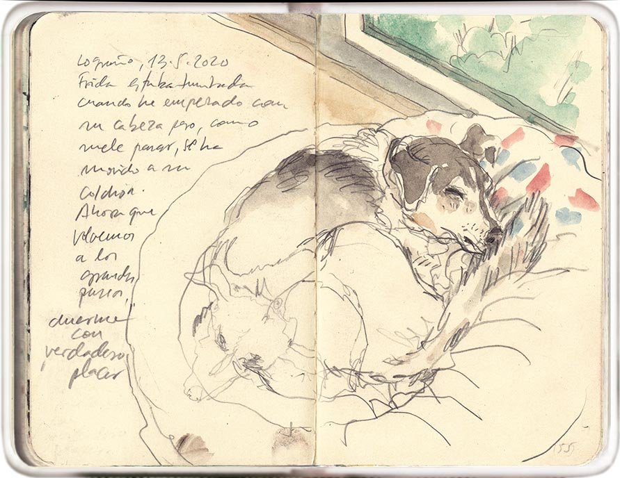 Frida estaba tumbada en el suelo cuando he empezado a dibujar su cabeza. Como suele pasar, se ha movido a su colchón. Ahora que podemos volver a los grandes paseos, duerme con verdadero placer.