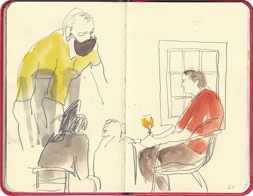 Fue la primera noche que salimos a tomar algo. Estar sentado en una terraza era como nuevo. Me puse a dibujar a la gente de las otras mesas, no sabía porqué, simplemente me dejaba llevar, despreocupado. Son esos ratos en que te sientes espectador de tu propia historia.