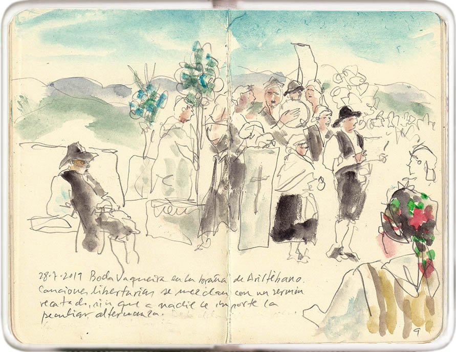 En la braña de Aristébano, canciones libertarias que se mezclan, en la boda vaqueira, con un sermón recatado, sin que a nadie le importe la peculiar alternancia.