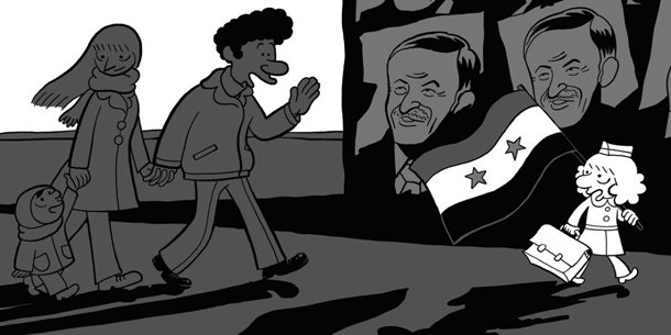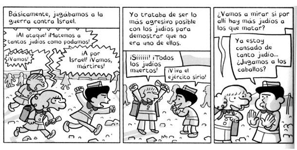 Entre palo y palo, la maestra sádica e inculta enseña a Riad y a sus compañeros el himno nacional sirio: la prioridad escolar era crear súbditos obedientes a Hafez el Asad. “Sin él, Siria se destruiría a sí misma y no existiríamos”, asegura la maestra, cual pitonisa nefasta. La Siria que vemos a través de la memoria de Riad es un país pobre donde el triunfo consiste en tener la casa más grande del pueblo y un Mercedes para viajar a la capital, donde los niños calzan rígidos zapatos de plástico hechos en China y se mueren de pulmonía porque los padres los llevan al médico demasiado tarde. Sattouf nos cuenta lo que los adultos no ven aunque pase por delante de sus ojos: los chantajes, miedos y peleas que sufre y ejercen los niños sin que sus padres se enteren. No lo tiene fácil Riad, niño de melena rubia en una clase de alumnos de tez oscura y pelo negro. Si quería integrarse tenía que destacar en el entretenimiento con más éxito del recreo: jugar a matar judíos.